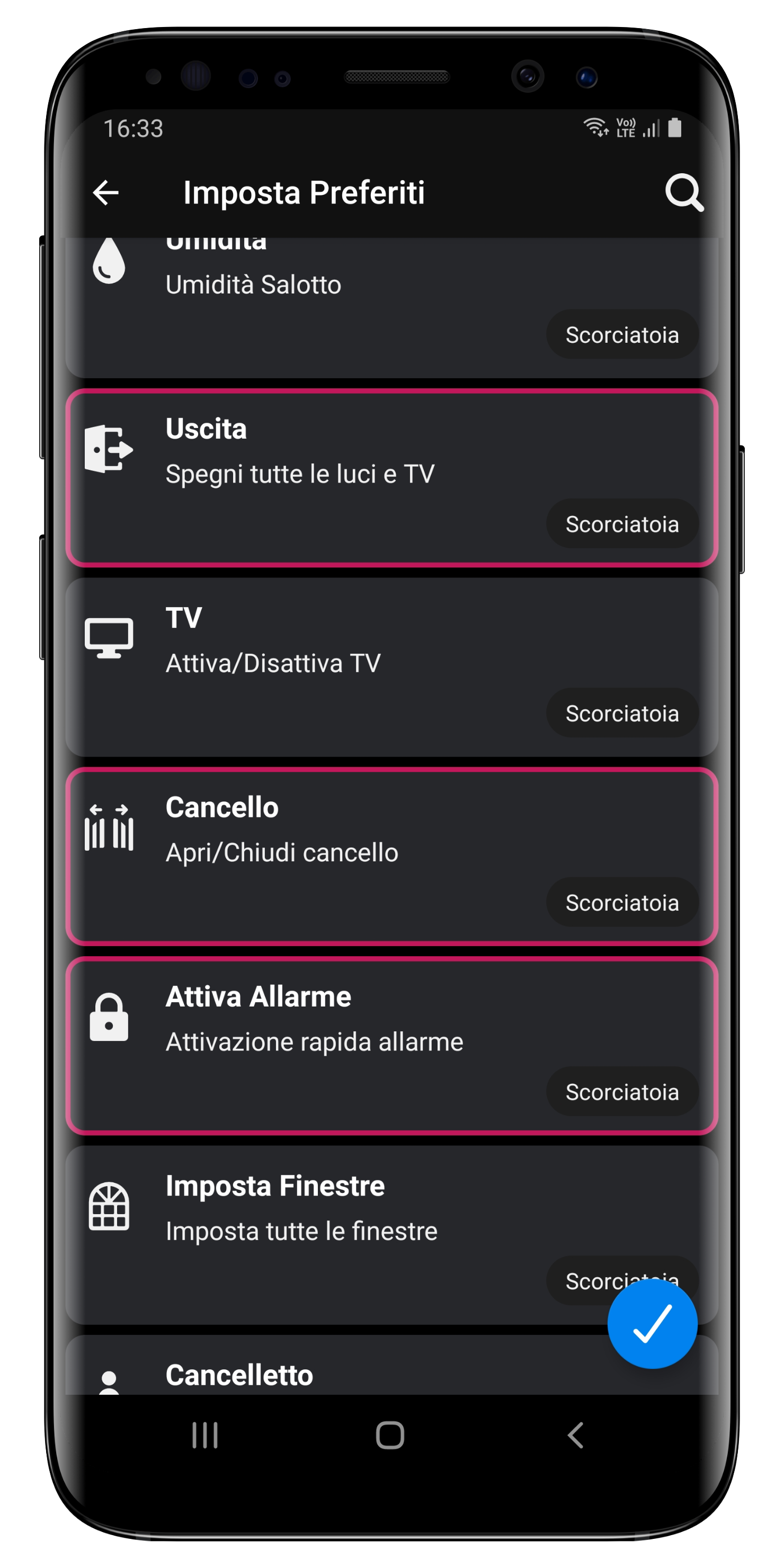 Si aprirà una pagina che ti permetterà di scegliere le Scorciatoie da aggiungere come preferiti, quindi clicca il tasto in basso a destra per confermare.