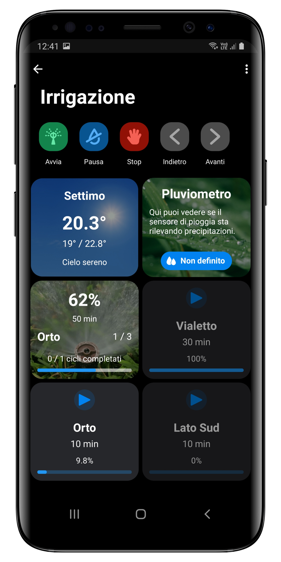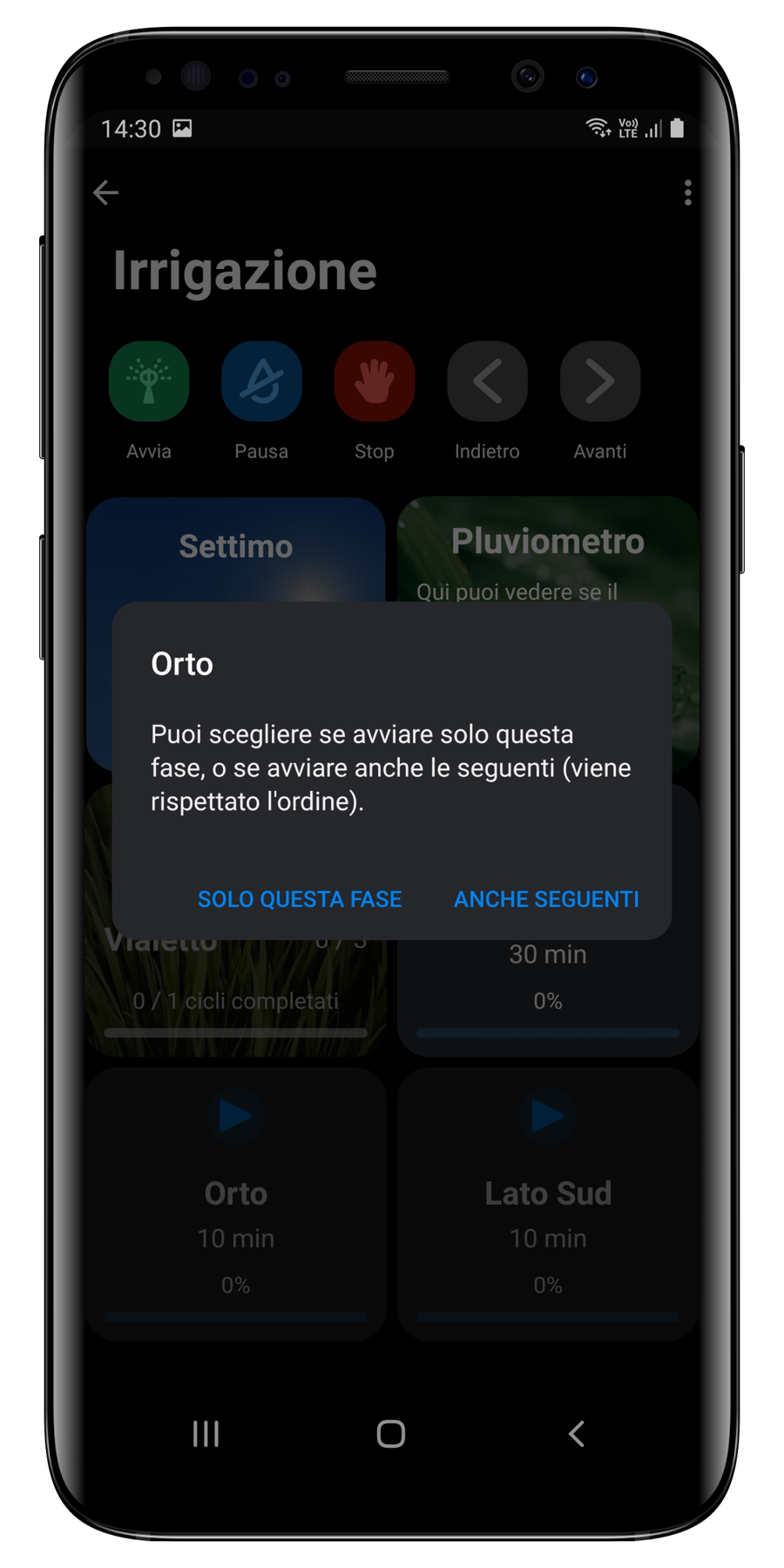 Pulsante Play: se desiderate irrigare una zona specifica potete premere il pulsante play e scegliere se avviare solo quella fase o anche le successive.
