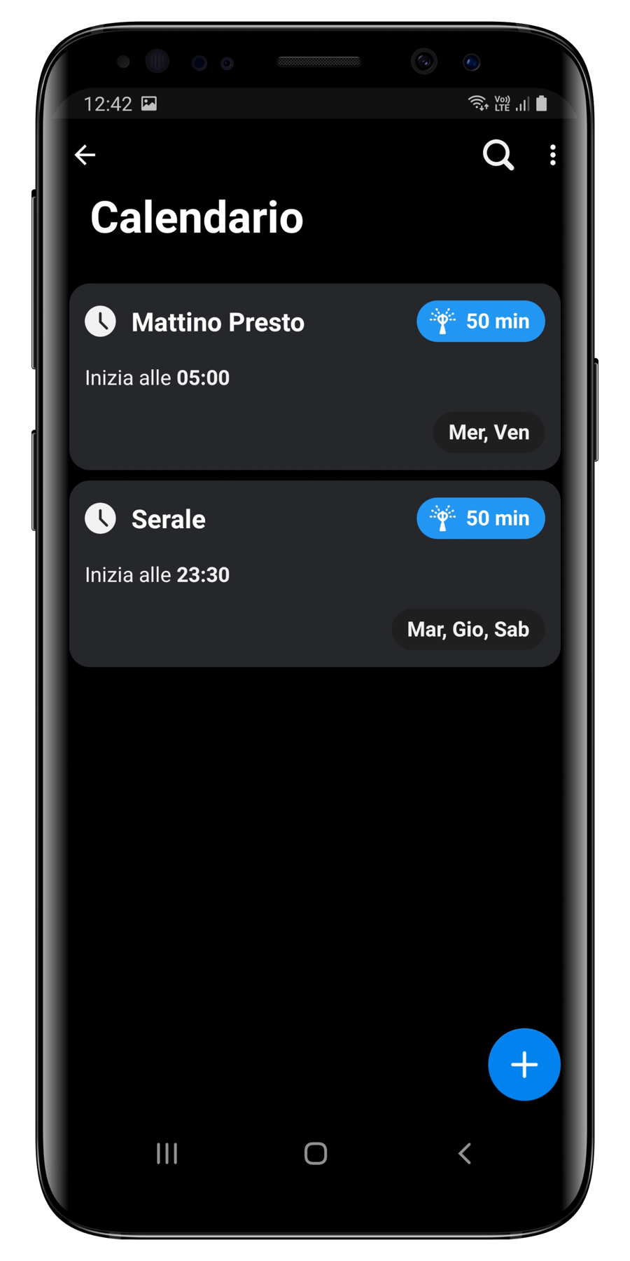 Una volta che avete aperto la pagina del calendario, premendo il tasto + in basso a destra potete procedere con la creazione di un evento; premendo i tre puntini in alto a destra è possibile attivare/disattivare tutti gli eventi configurati.