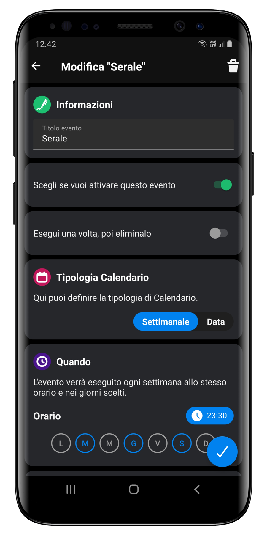 La creazione di un evento è piuttosto semplice e vi permette di impostare un nome per l'evento (es. Irrigazione Serale), di definire l'orario di avvio del ciclo e i giorni della settimana per cui volete attivare tale configurazione.