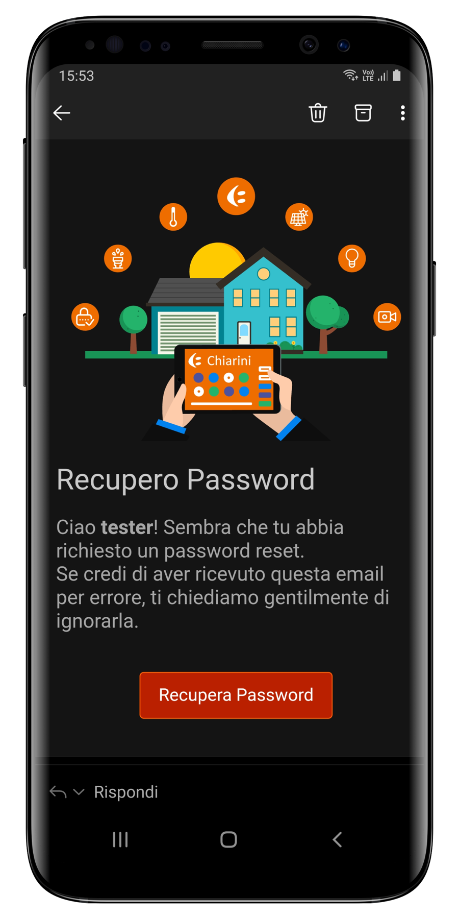 Verrà quindi inviata una email all'indirizzo associato al tuo account. Clicca quindi il pulsante Recupera Password sull'email ricevuta.
