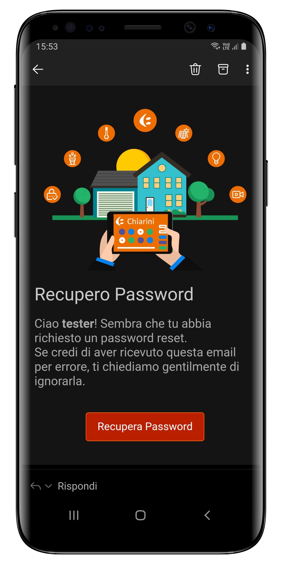 Verrà quindi inviata una email all'indirizzo associato al tuo account. Clicca quindi il pulsante Recupera Password sull'email ricevuta.