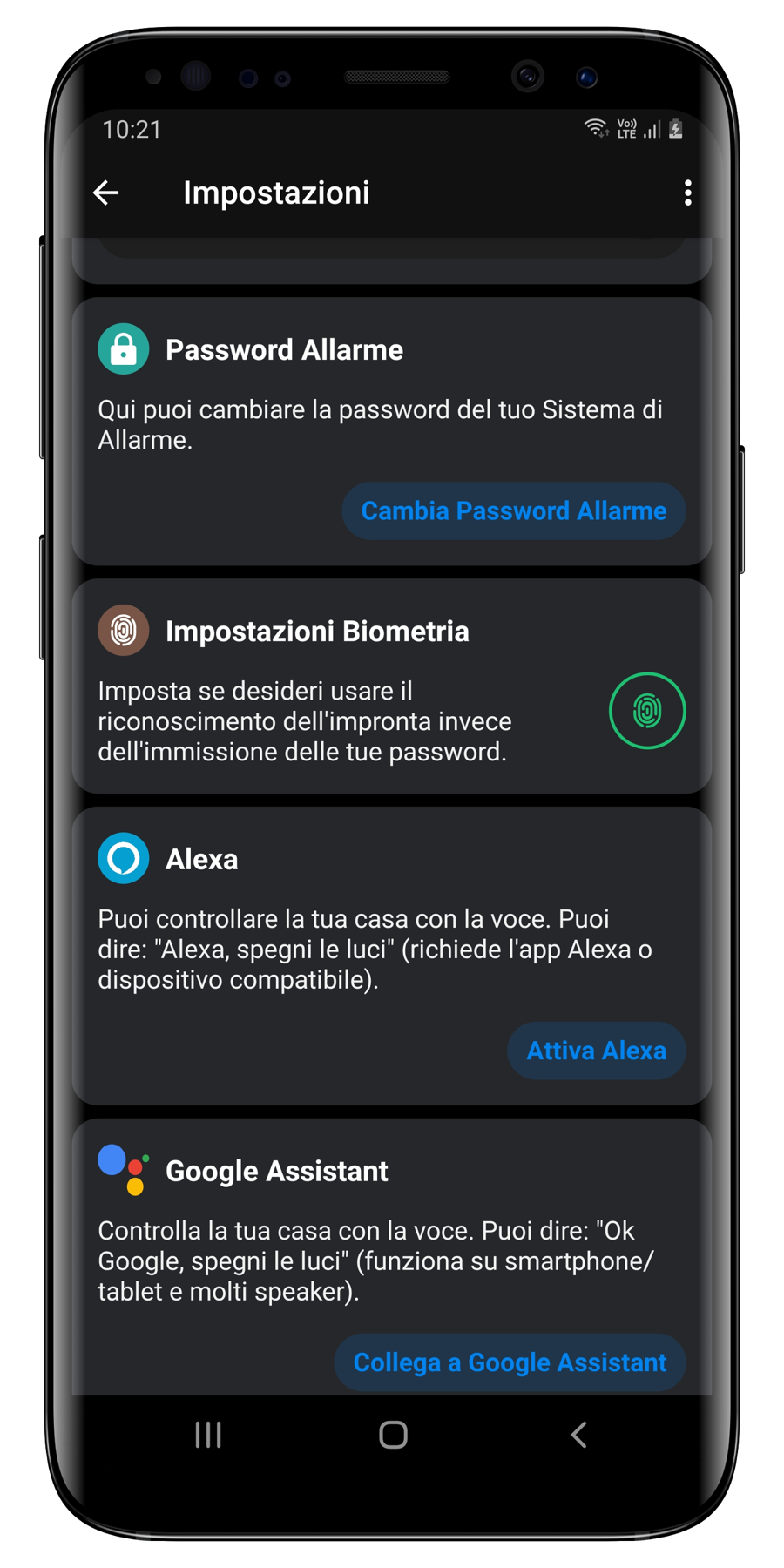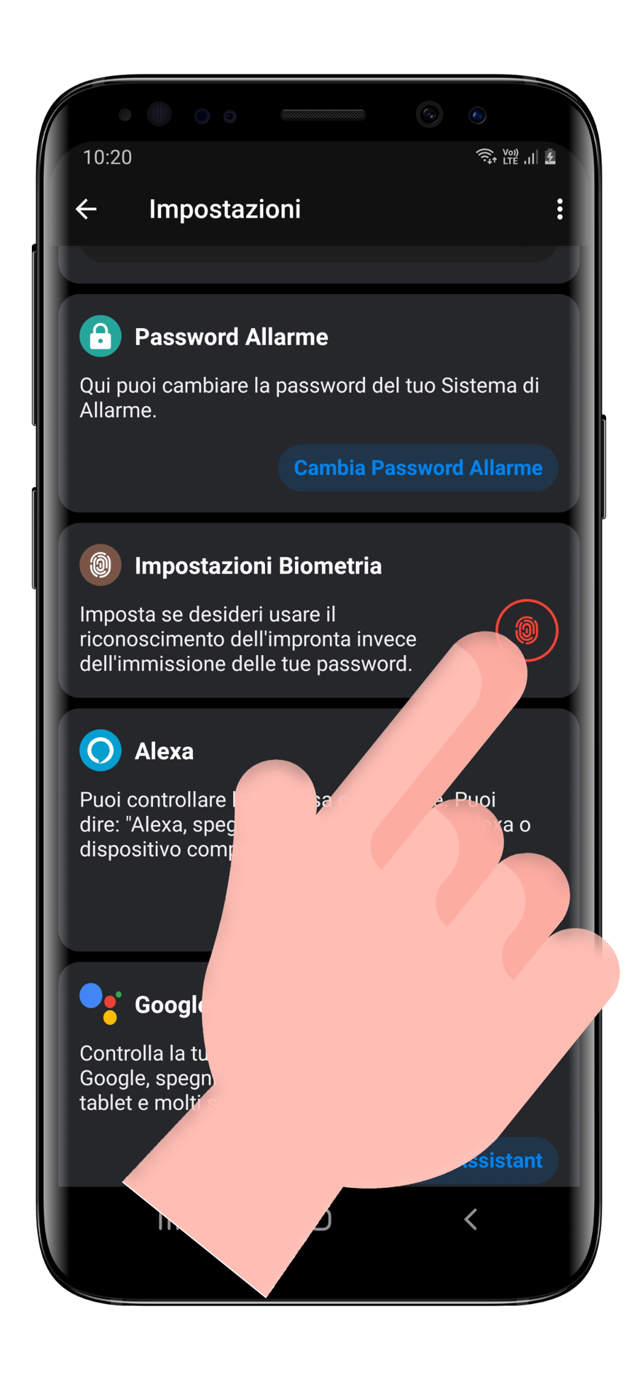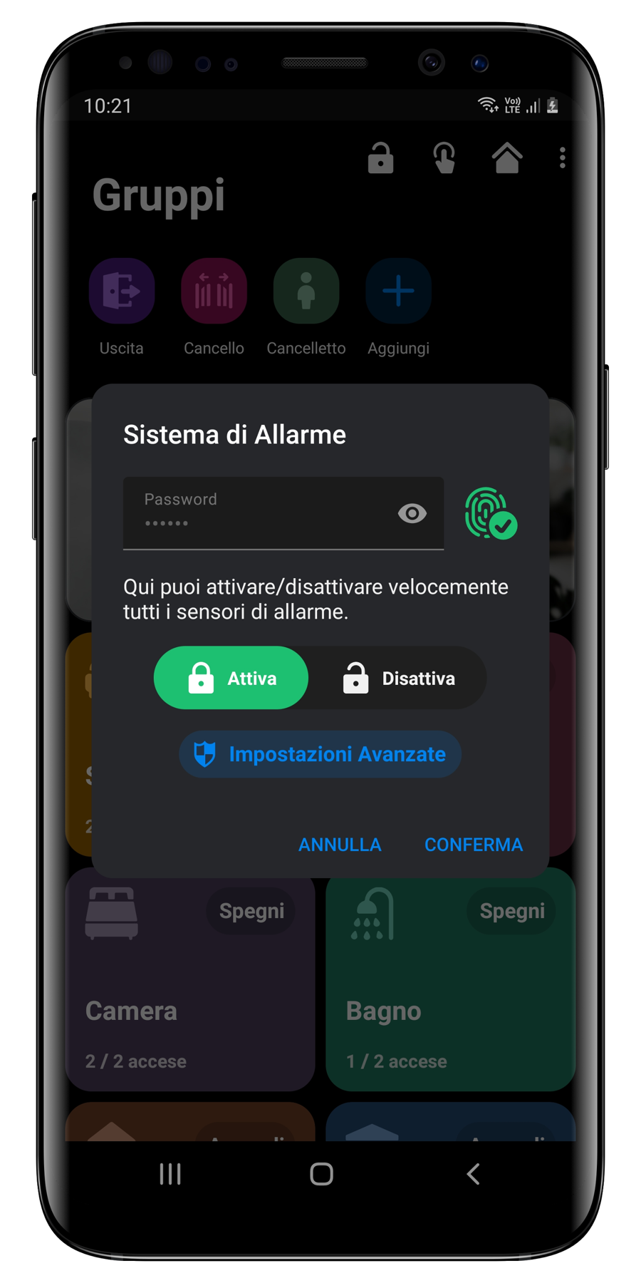 Per velocizzare ulteriormente le operazioni sul sistema di allarme è possibile attivare il controllo biometrico (sia facciale che impronta), così da evitare l'immissione della password.