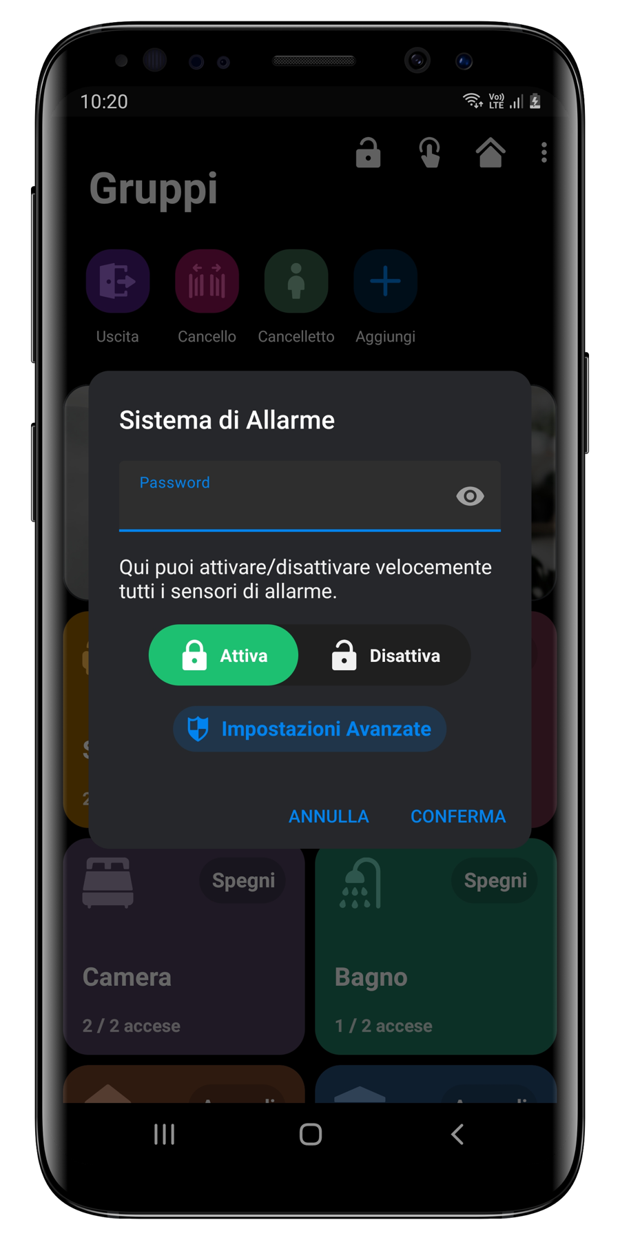 Accedendo alle impostazioni avanzate avrete modo di gestire i sensori di allarme singolarmente, e nel caso in cui siano stati configurati più settori di allarme, avrete la possibilità di gestire le zone separatamente.