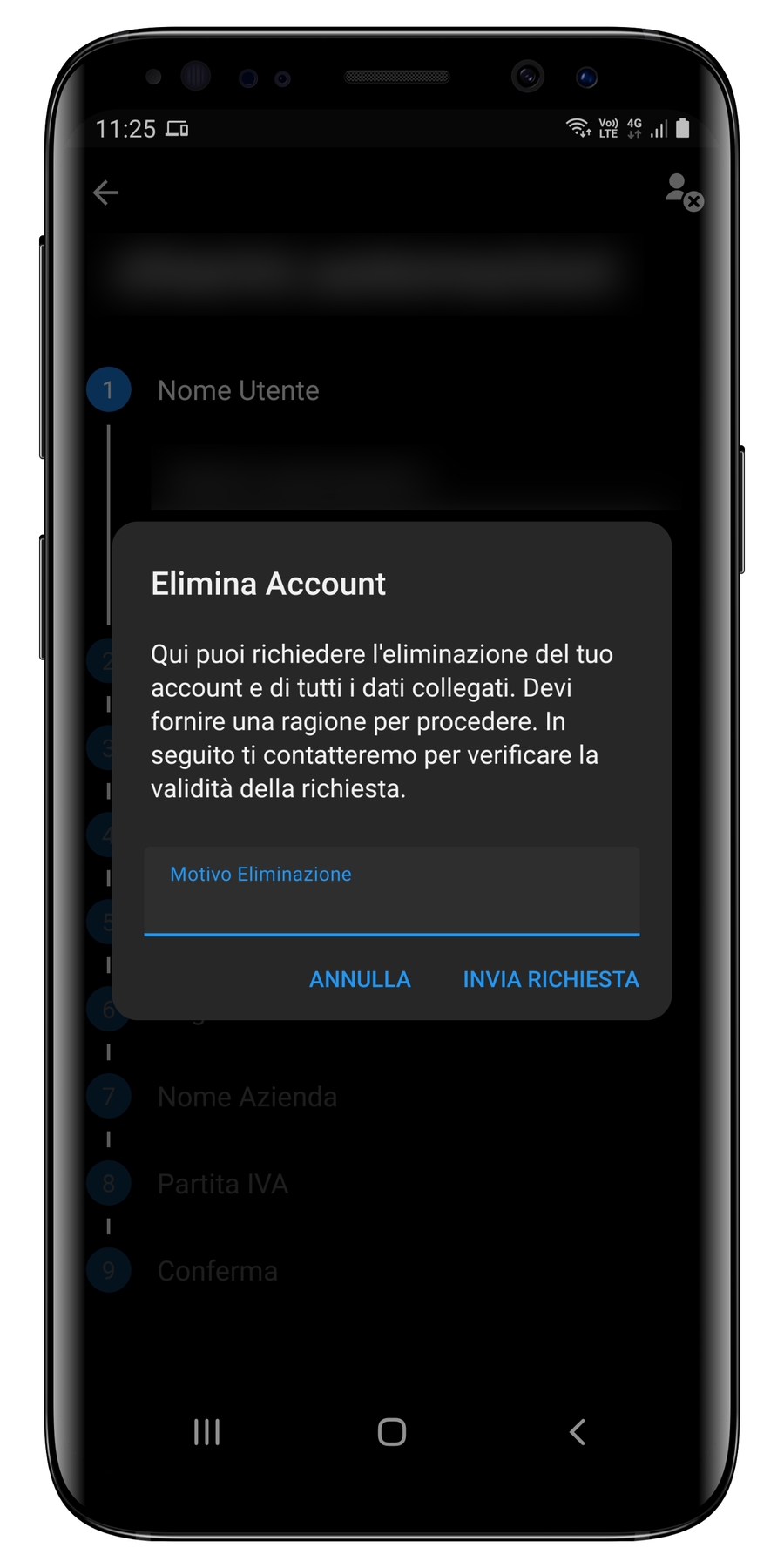 Di seguito i passaggi per richiedere l'eliminazione dell'account.