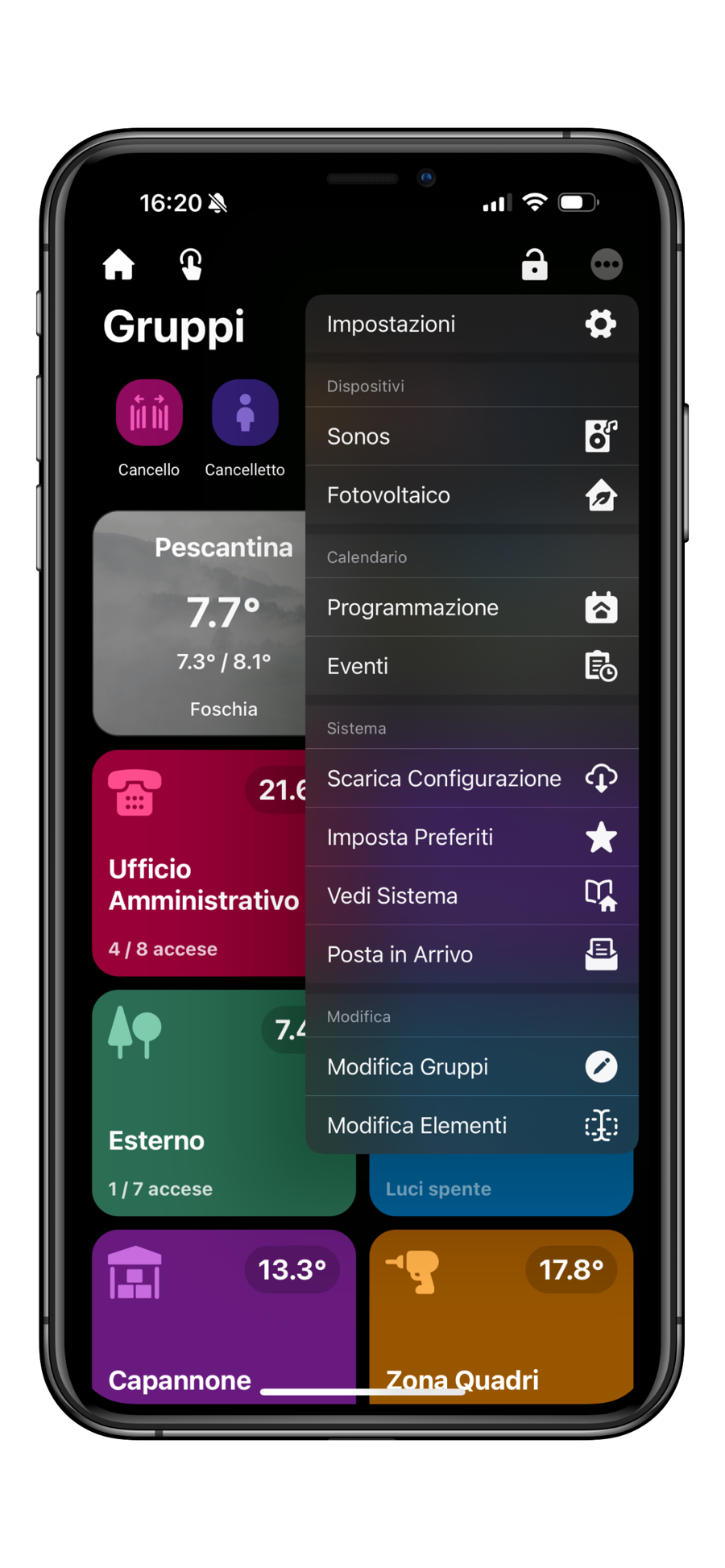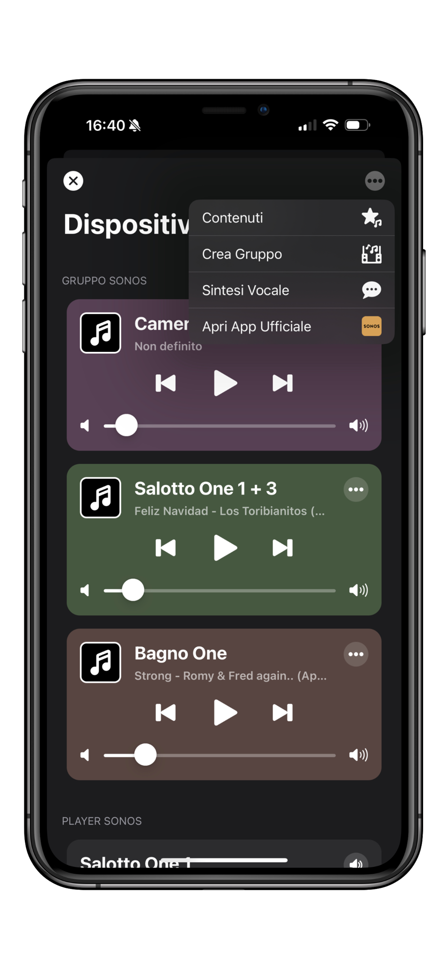 Una volta completata la connessione potrai accedere al tuo Sistema Sonos anche dall'app OHMe. Clicca sui tre puntini in alto a destra e seleziona Sonos.