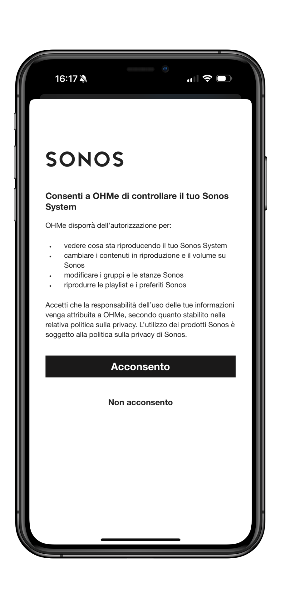 Così facendo autorizzerai OHMe a controllare il tuo Sistema Sonos.