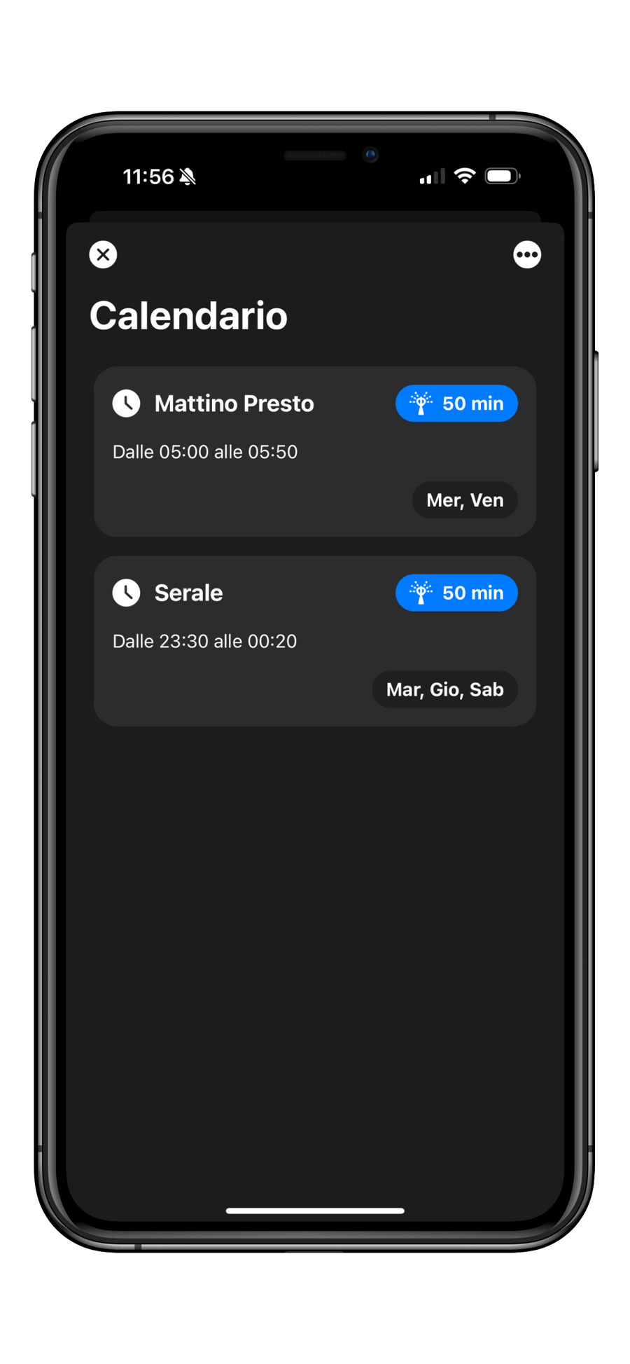 Per configurare la programmazione dovete premere il pulsante con i tre puntini in alto a destra, quindi il tasto Calendario.
