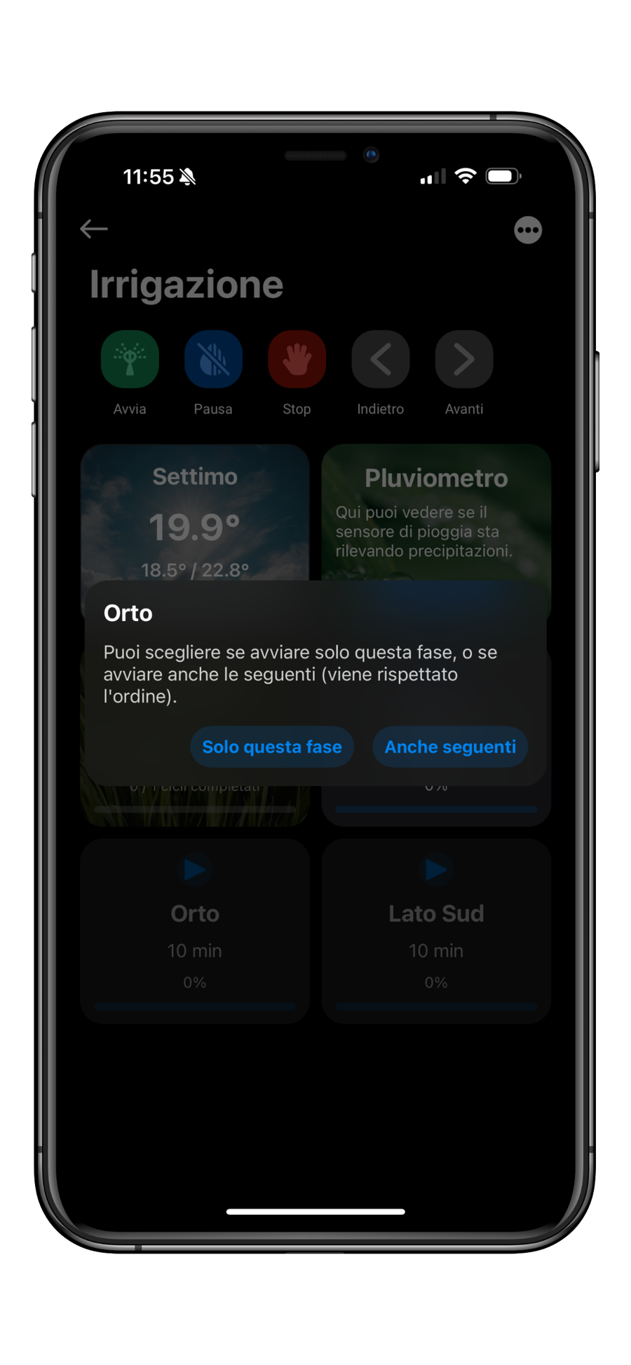 Pulsante Play: se desiderate irrigare una zona specifica potete premere il pulsante play e scegliere se avviare solo quella fase o anche le successive.