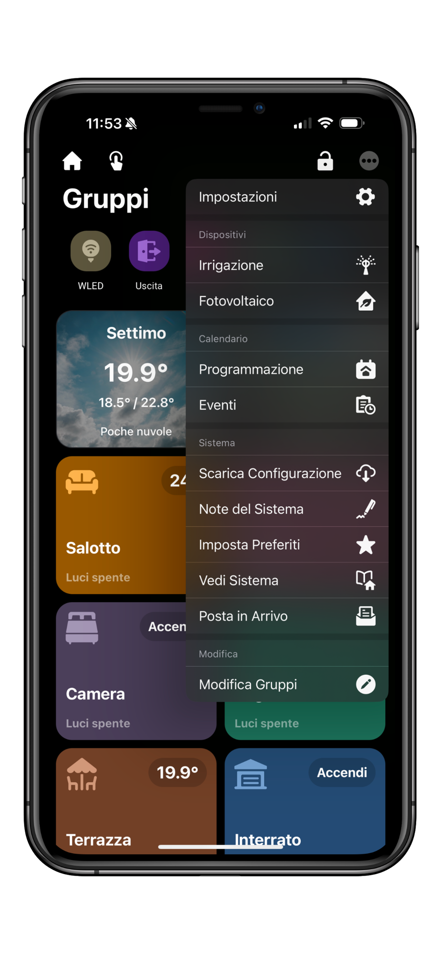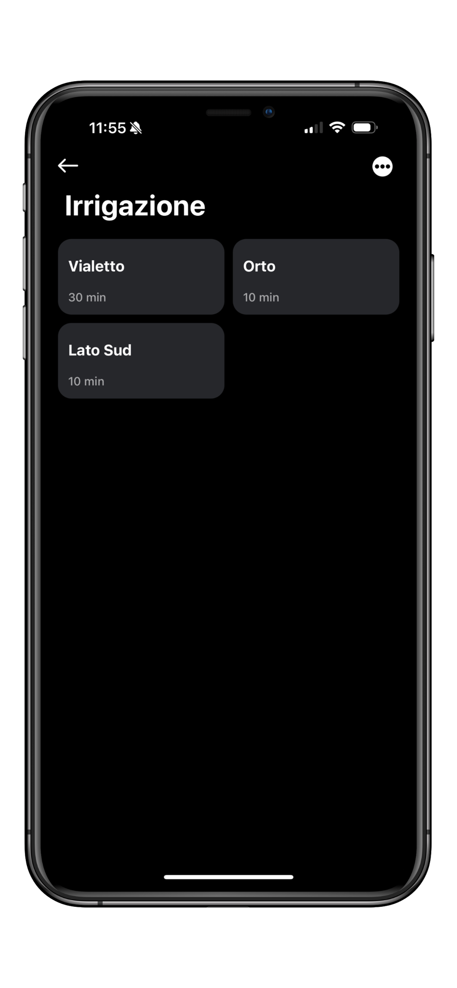 Per accedere al Sistema di Irrigazione è sufficiente premere i tre puntini in alto a destra, quindi il tasto Irrigazione.