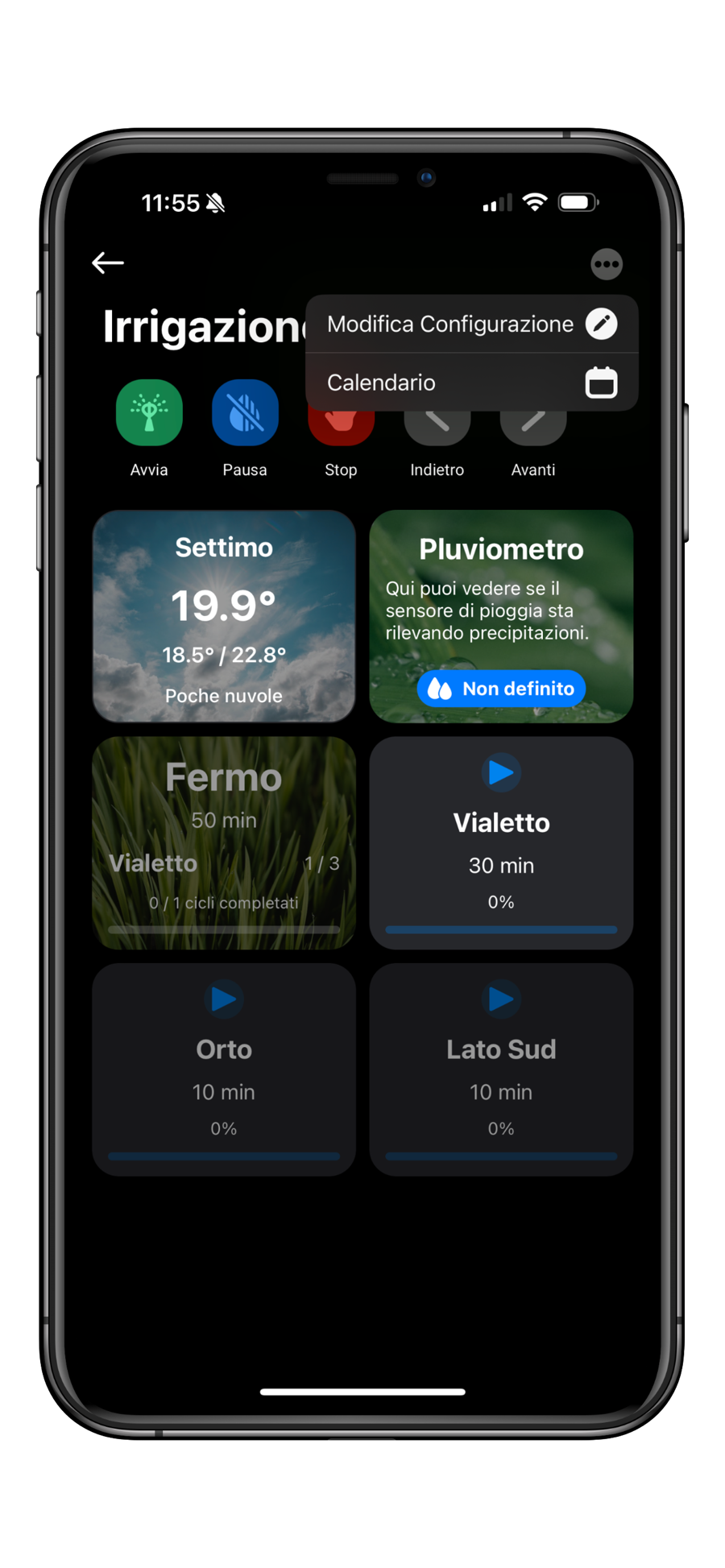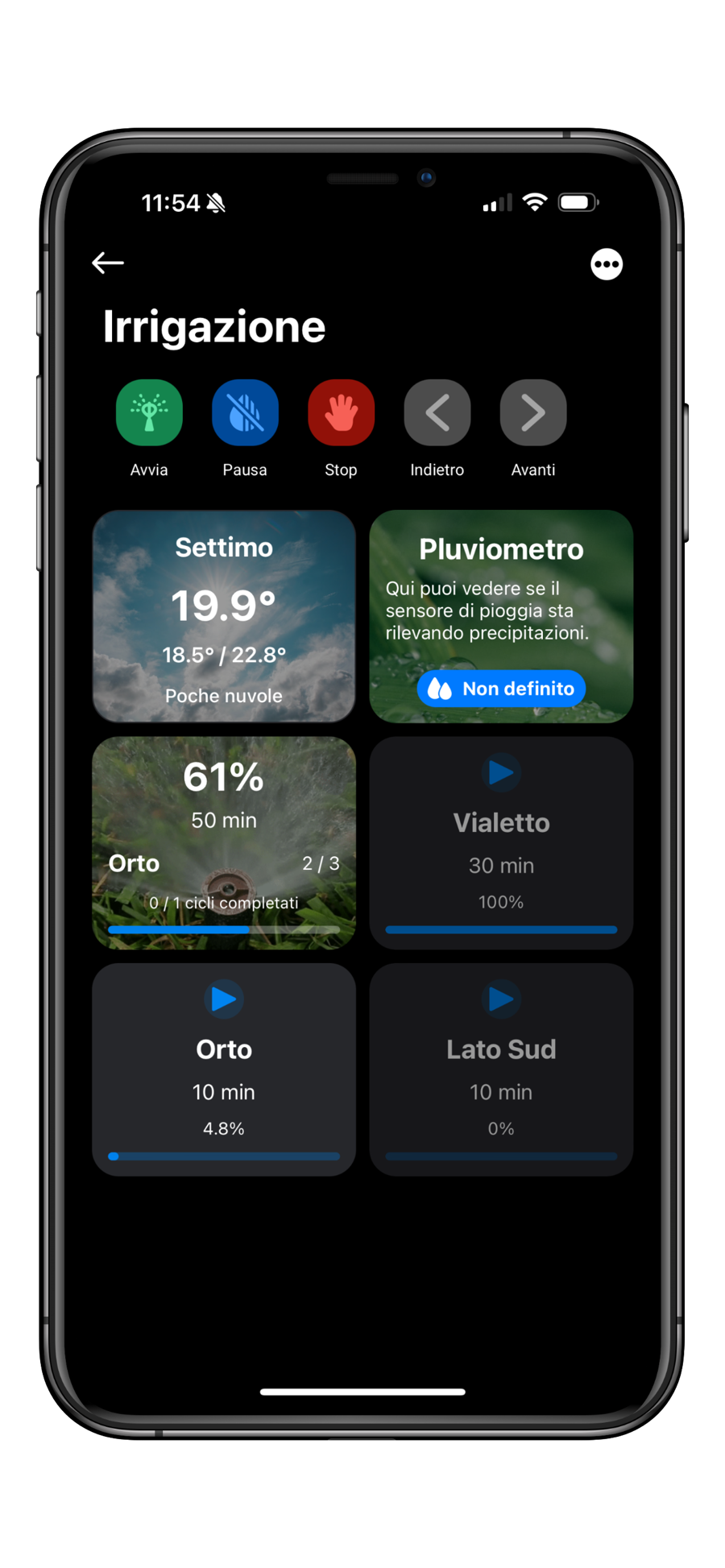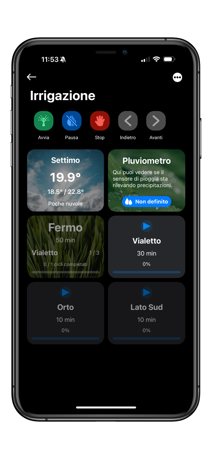 Quando parliamo di zone o fasi, intendiamo fondamentalmente la stessa cosa. Ogni zona del giardino è associata a una specifica fase del ciclo di irrigazione. È sulle fasi che avete la possibilità di intervenire per gestire il sistema.