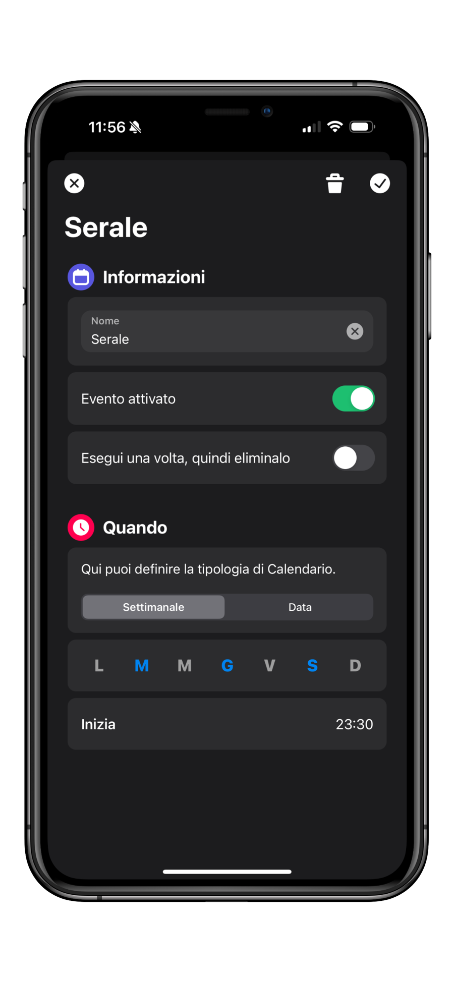 La creazione di un evento è piuttosto semplice e vi permette di impostare un nome per l'evento (es. Irrigazione Serale), di definire l'orario di avvio del ciclo e i giorni della settimana per cui volete attivare tale configurazione.