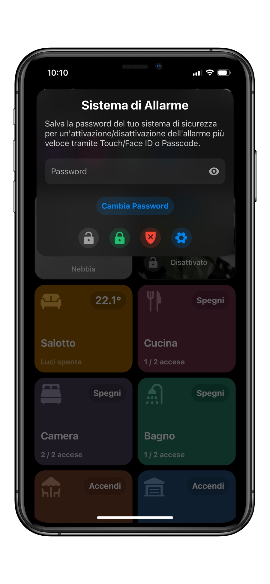 Cliccate sull'icona rossa e inserite la password del sistema di allarme nella finestra visualizzata.