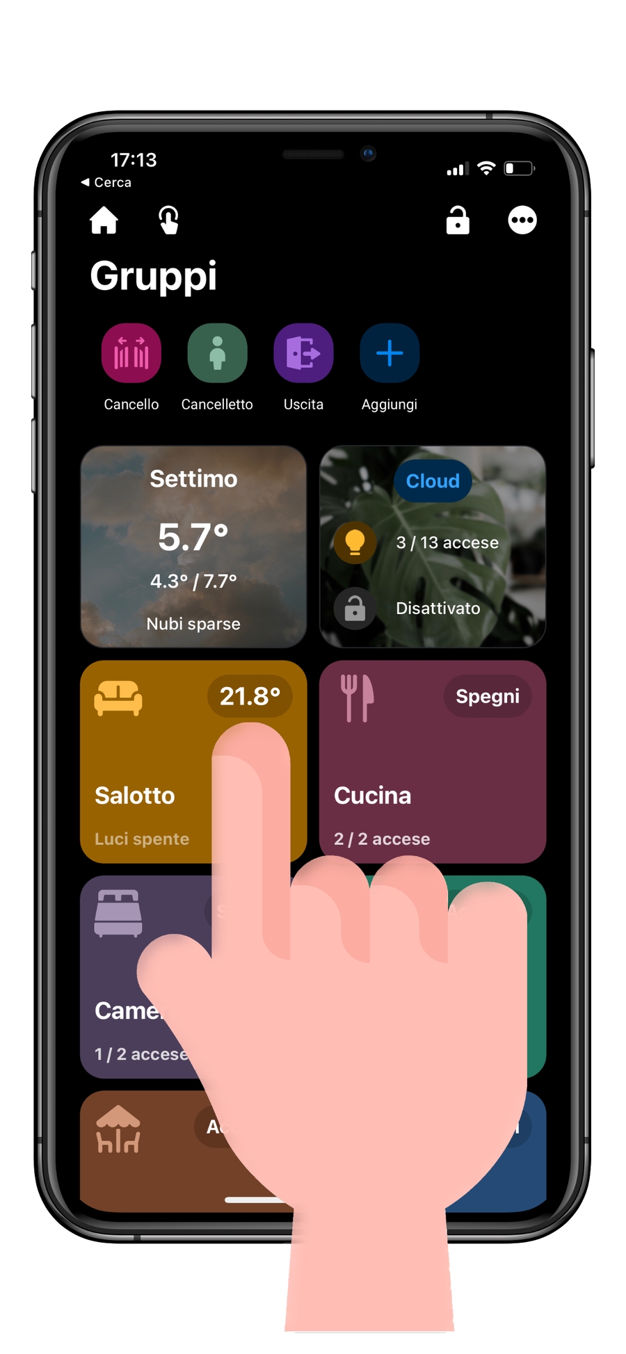 Una volta aperta l’app cliccare sulla stanza/gruppo di cui si vuole regolare la temperatura. Nell’esempio proposto modificheremo la regolazione della stanza Salotto.