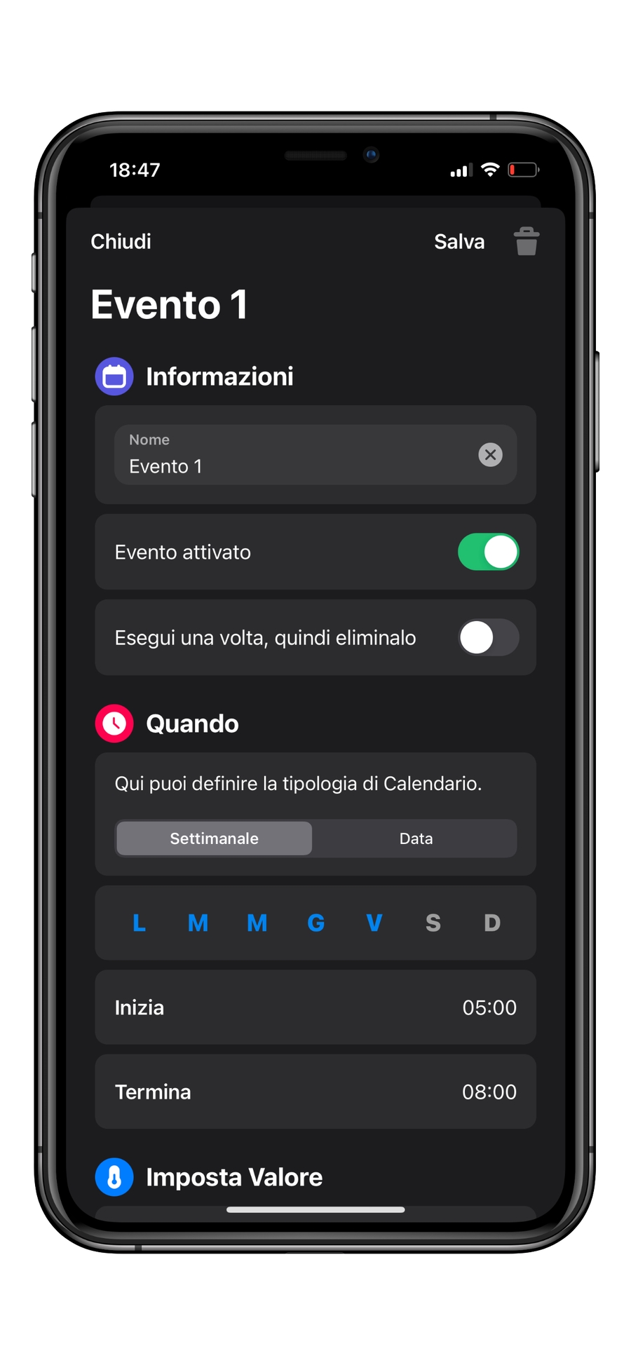 Spesso non si desidera spegnere completamente il termostato, ma piuttosto rimodulare il set con un valore più basso/alto (a seconda che parliamo di caldo o freddo); per fare ciò è necessario disattivare tale opzione e creare altri eventi con il set desiderato.