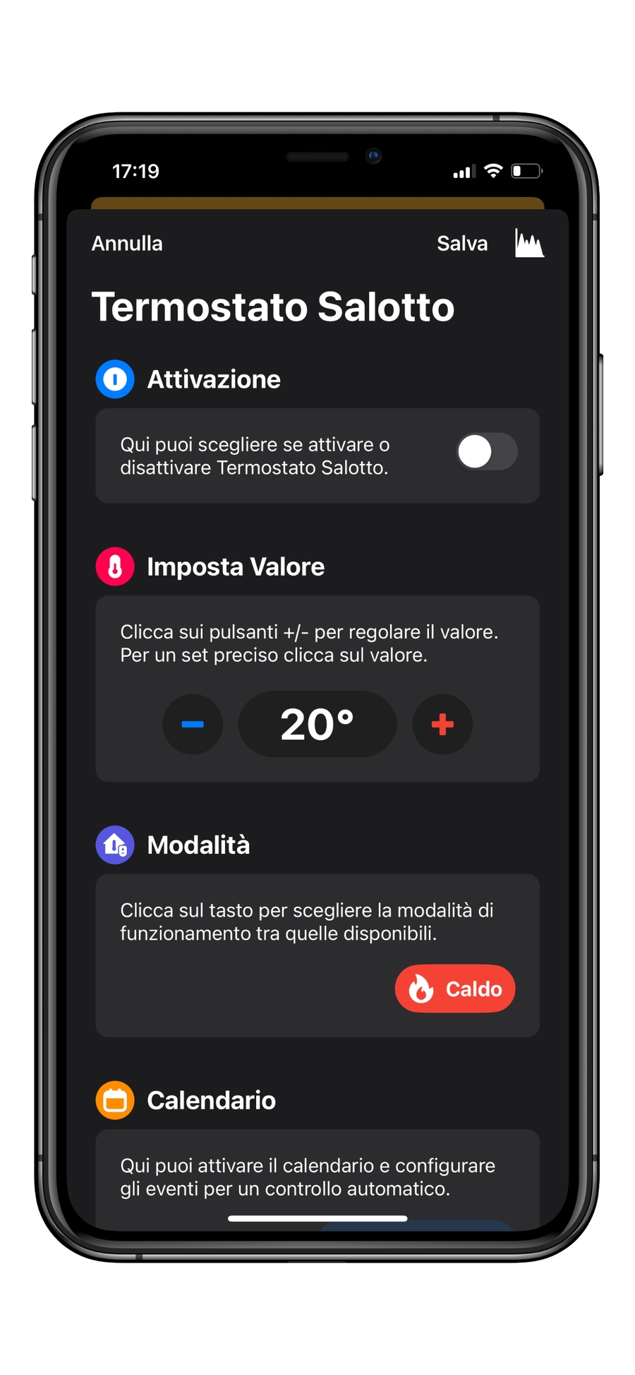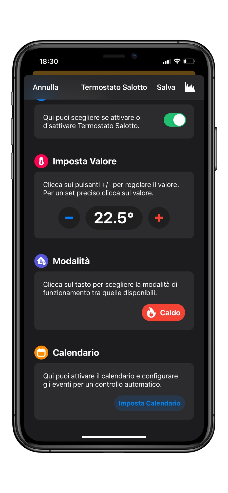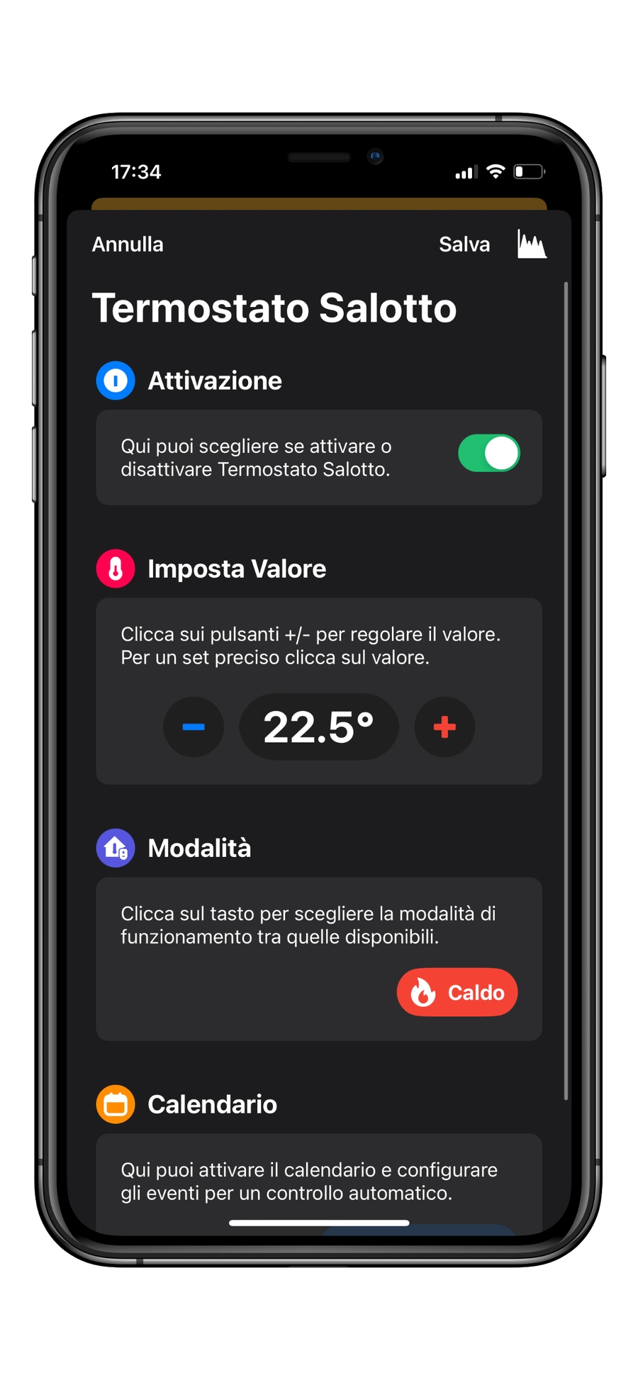 Per ora ci limiteremo ad attivare il termostato e ad impostare la temperatura a 22.5°C. Quindi premiamo il pulsante Salva in alto a destra.