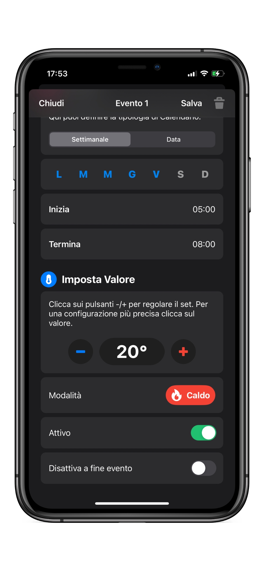 Andiamo quindi ad impostare un set di 20°C e scegliamo Caldo come modalità. Disattiviamo inoltre l'opzione Disattiva a fine evento, così evitiamo che il termostato venga disattivato al termine della fascia oraria.