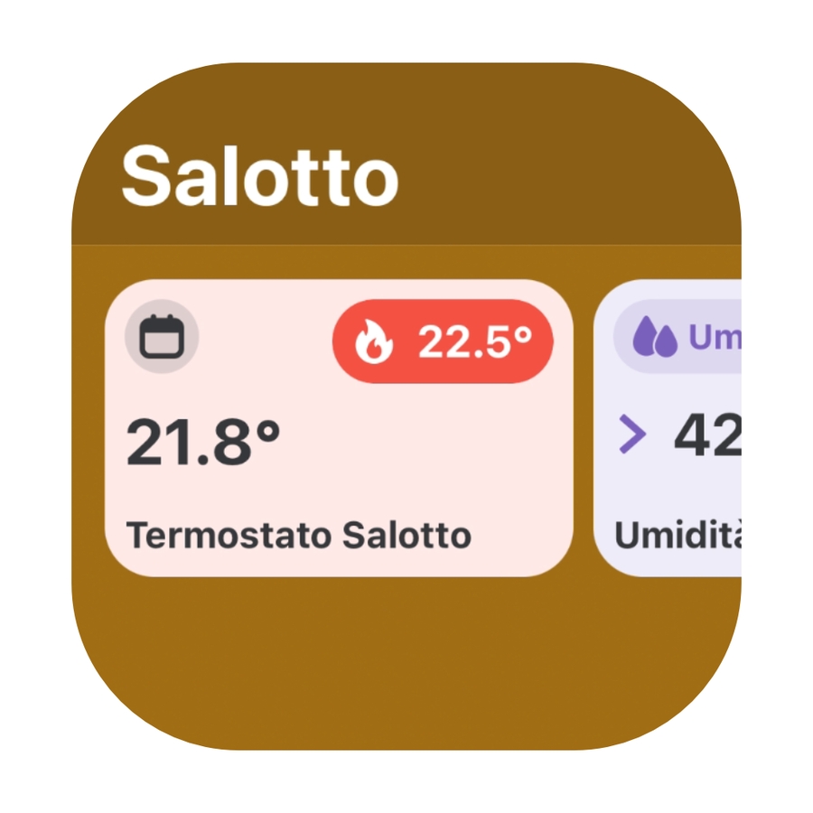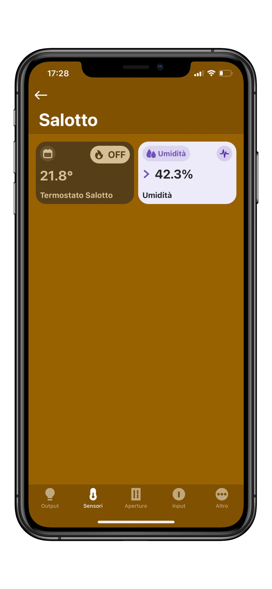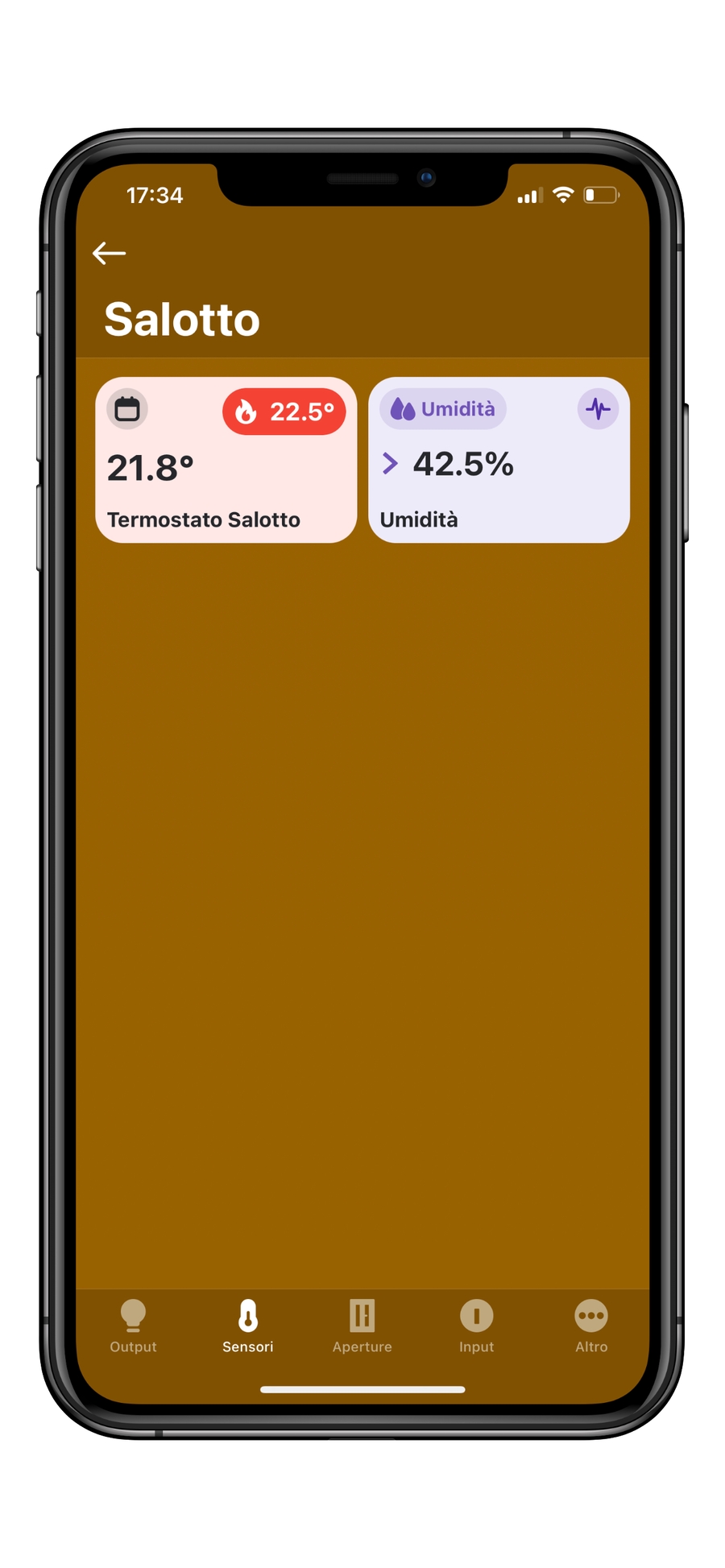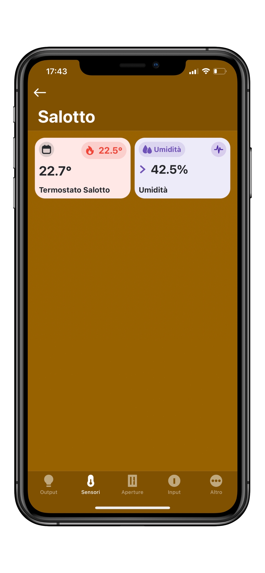 Selezionare la pagina dei Sensori (pulsante presente nella barra inferiore) per visualizzare termostati, umidostati, sensori (ecc.) presenti in quella stanza/gruppo.