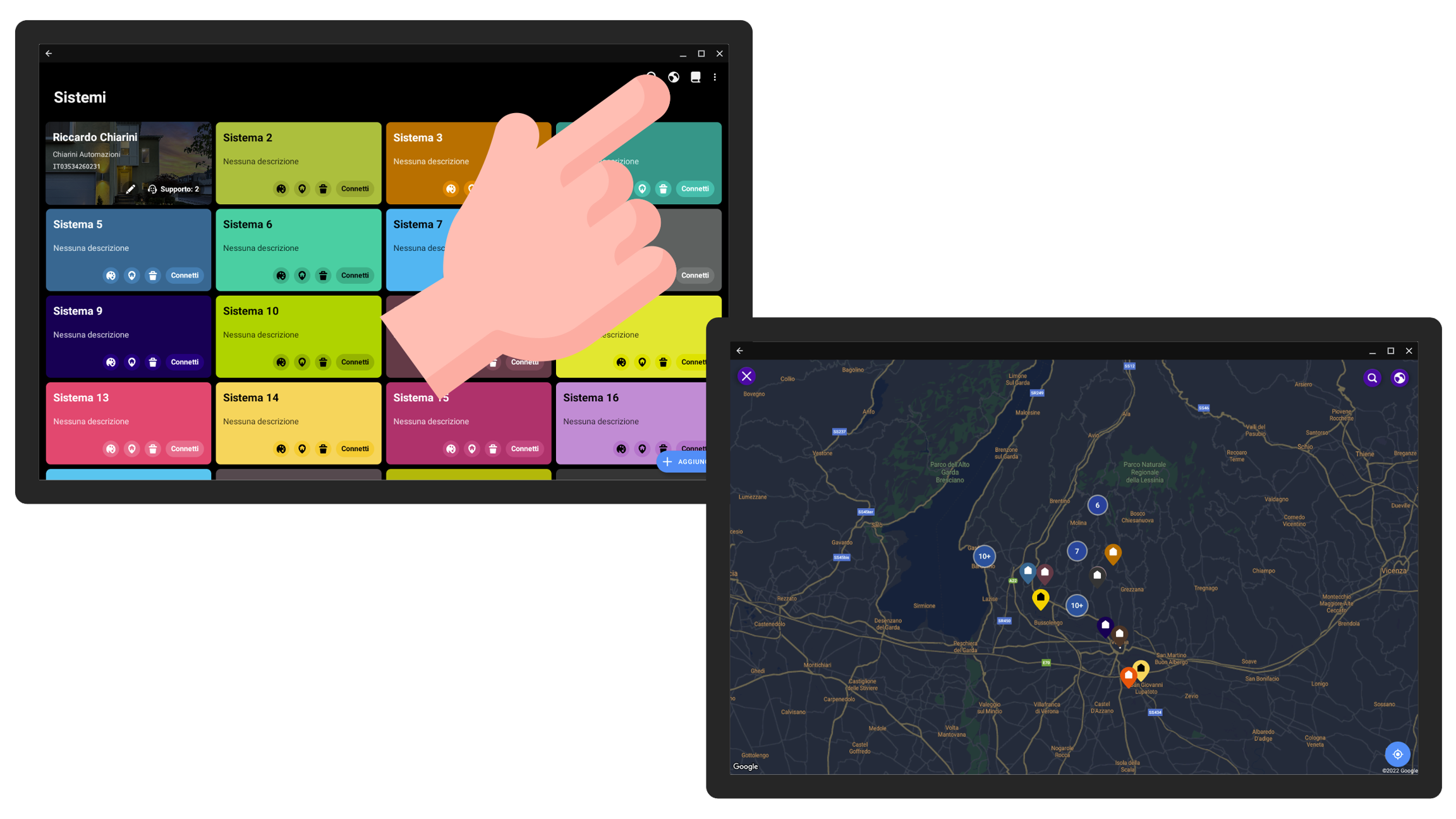 L'app di configurazione vi permette di visualizzare una mappa con la posizione geografica degli impianti. Cliccando sugli elementi della mappa è possibile visualizzare il nome dell'impianto e, cliccando su di esso, potete effettuare la connessione.