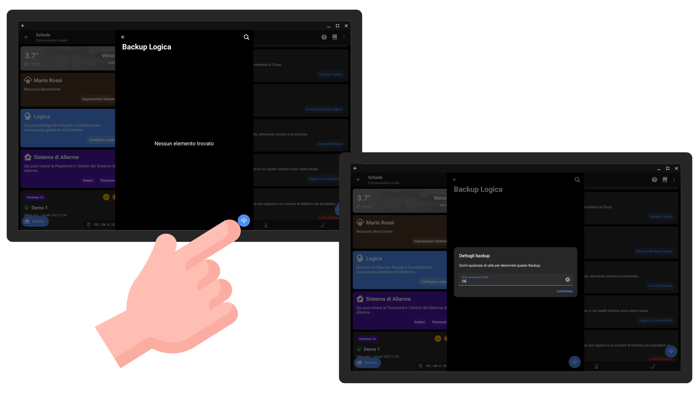 L'app permette di effettuare il backup dei sistemi a cui ci si è collegati, della Logica, della configurazione degli elementi di una scheda e delle sue impostazioni.