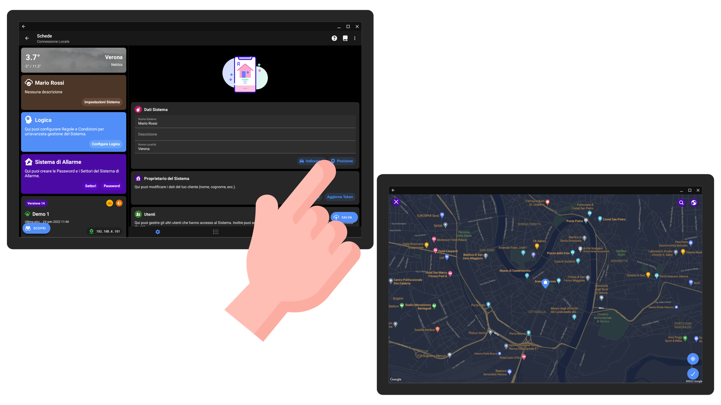 Per impostare la posizione del sistema dovete accedere all'impianto, quindi cliccare Impostazioni Impianto; lì cliccate il tasto Posizione, così da aprire la mappa. Per definire la posizione dovete cliccare direttamente sulla mappa; è possibile cercare l'indirizzo preciso cliccando sul tasto Cerca in alto a destra.
