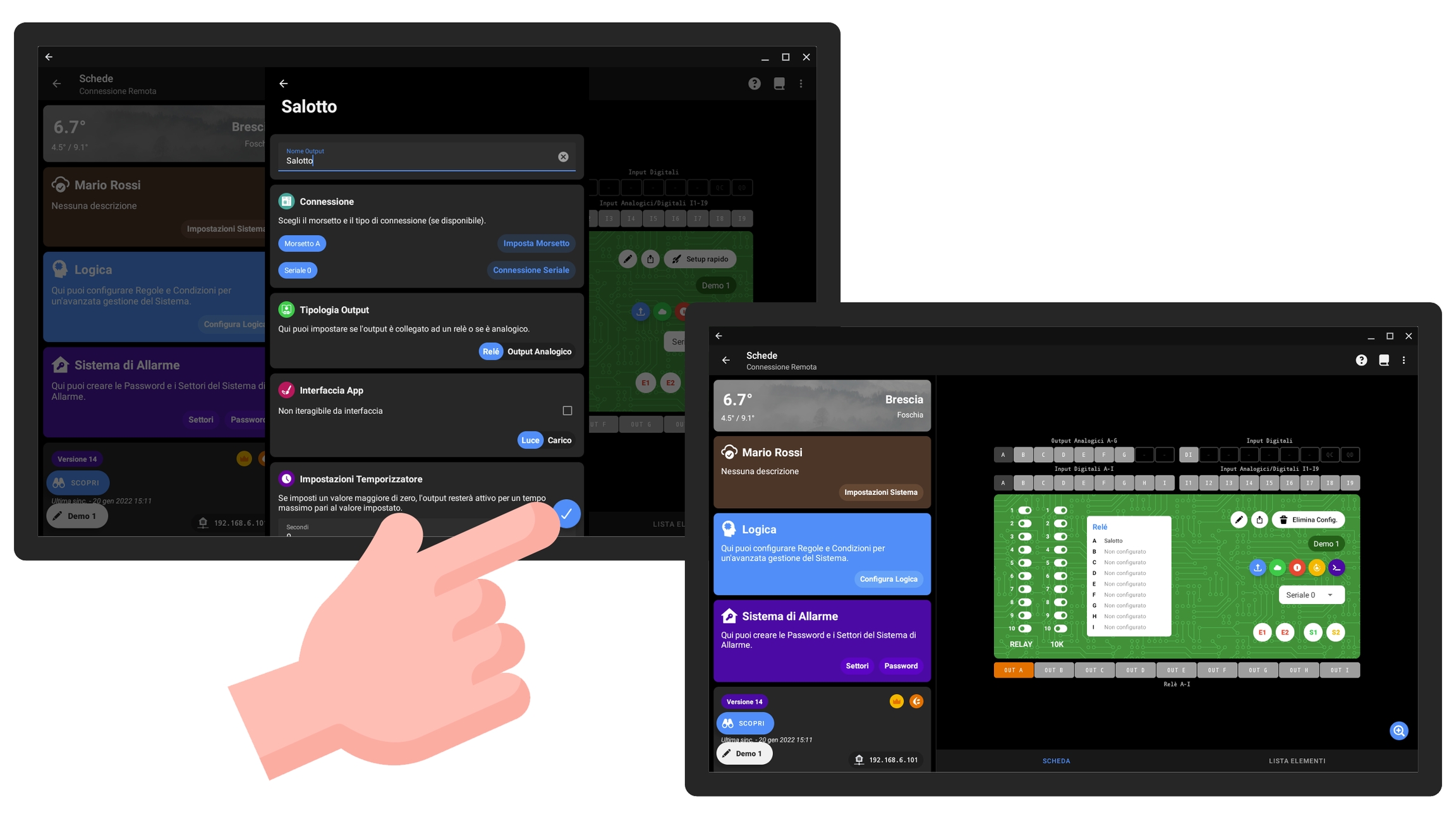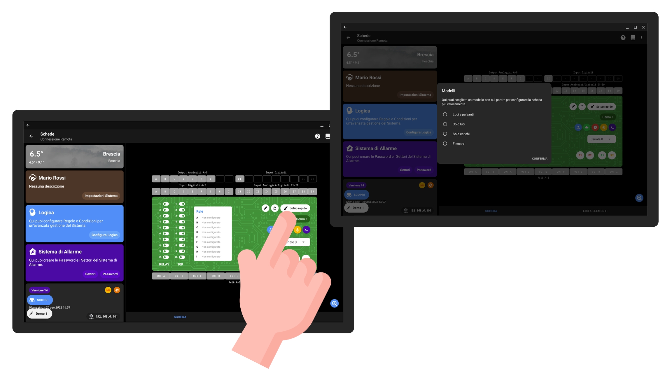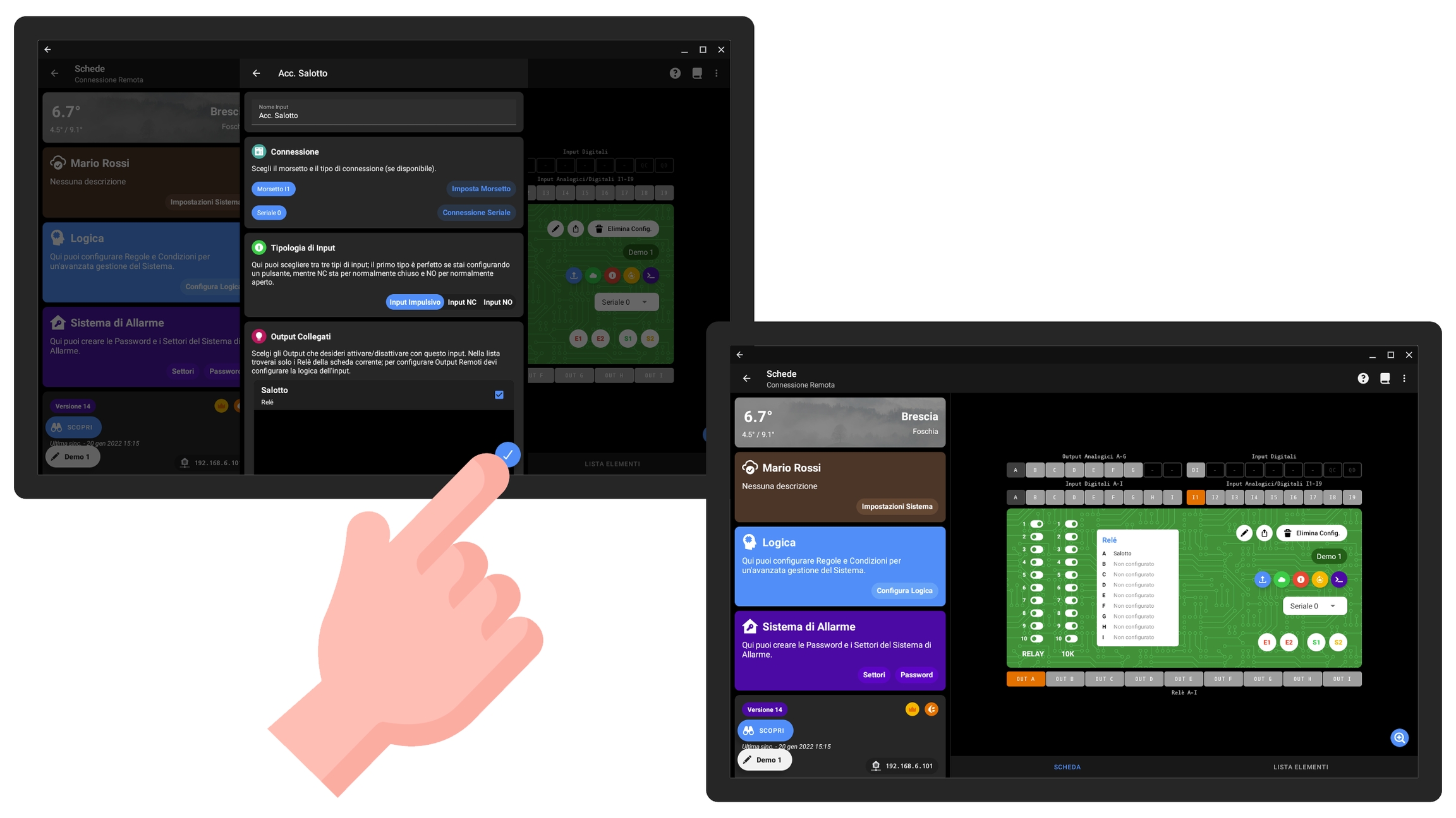 In questa sezione andremo ad elencare alcuni dei collegamenti più frequenti, mostrando sia la modalità di cablaggio che i passaggi per procedere con la configurazione dall'app.