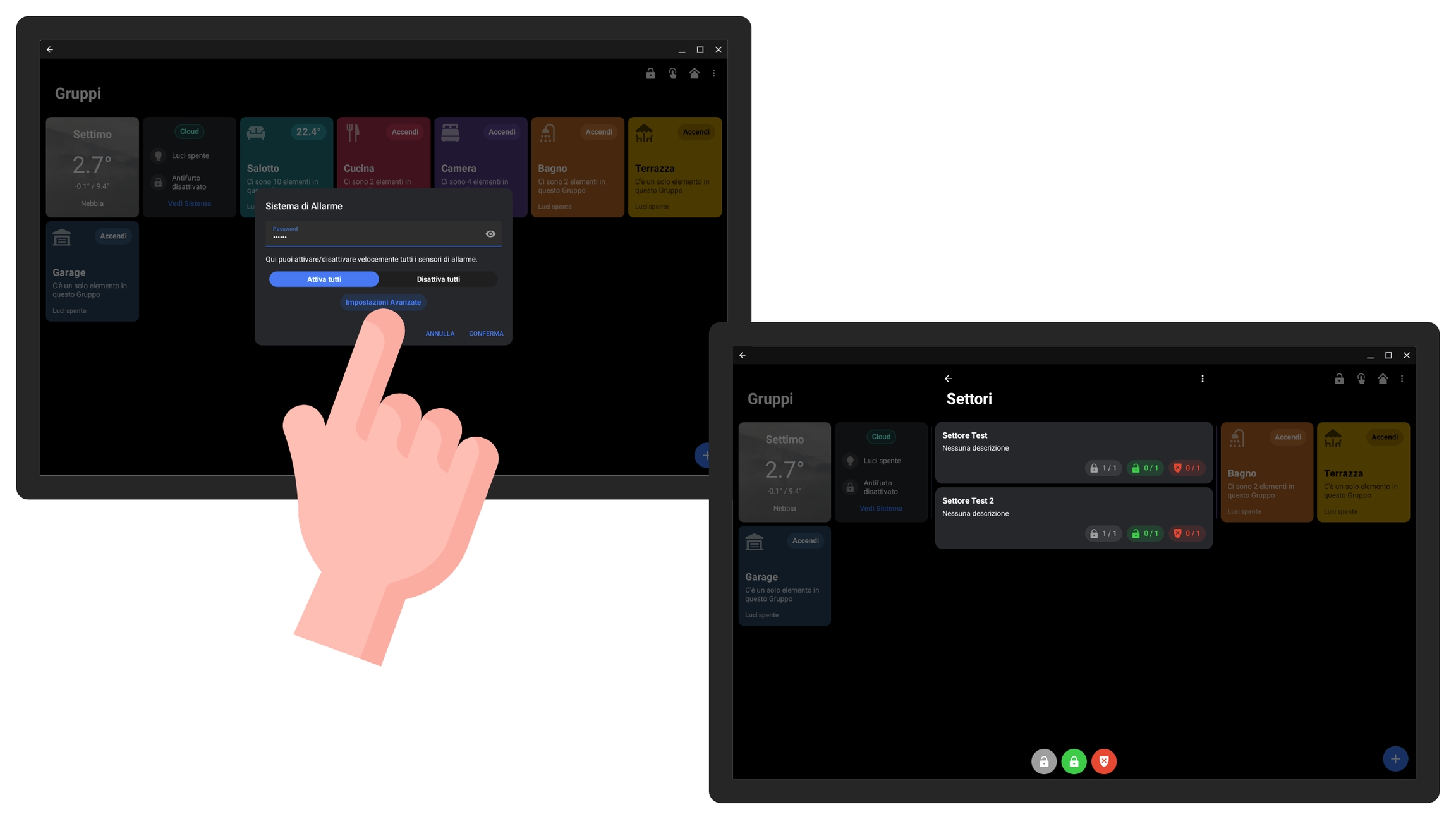 Digitare la password e premere su Impostazioni Avanzate per visualizzare i settori. Per una rapida attivazione/disattivazione di tutti i sensori contenuti nei settori di allarme (accessibili con quella password), scegliere Attiva tutti o Disattiva tutti e premere il pulsante Conferma.