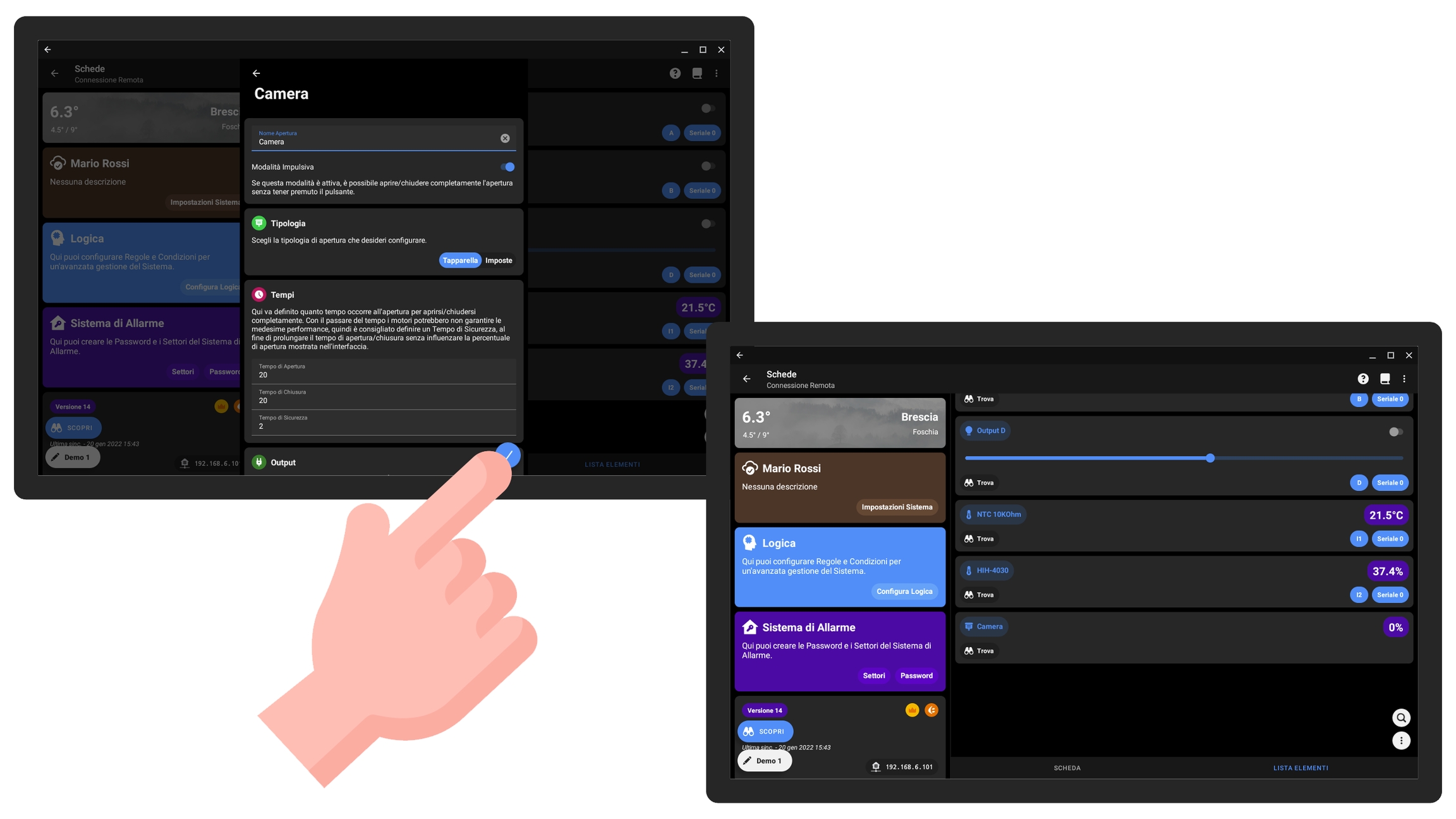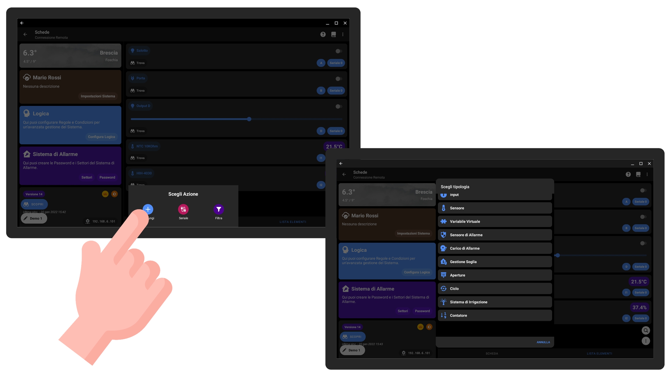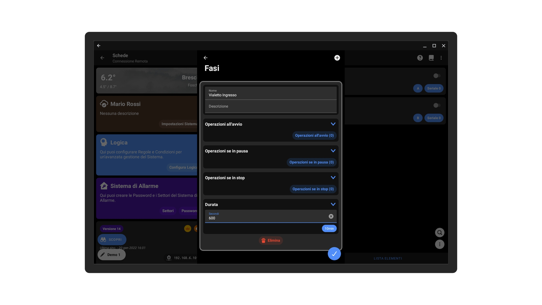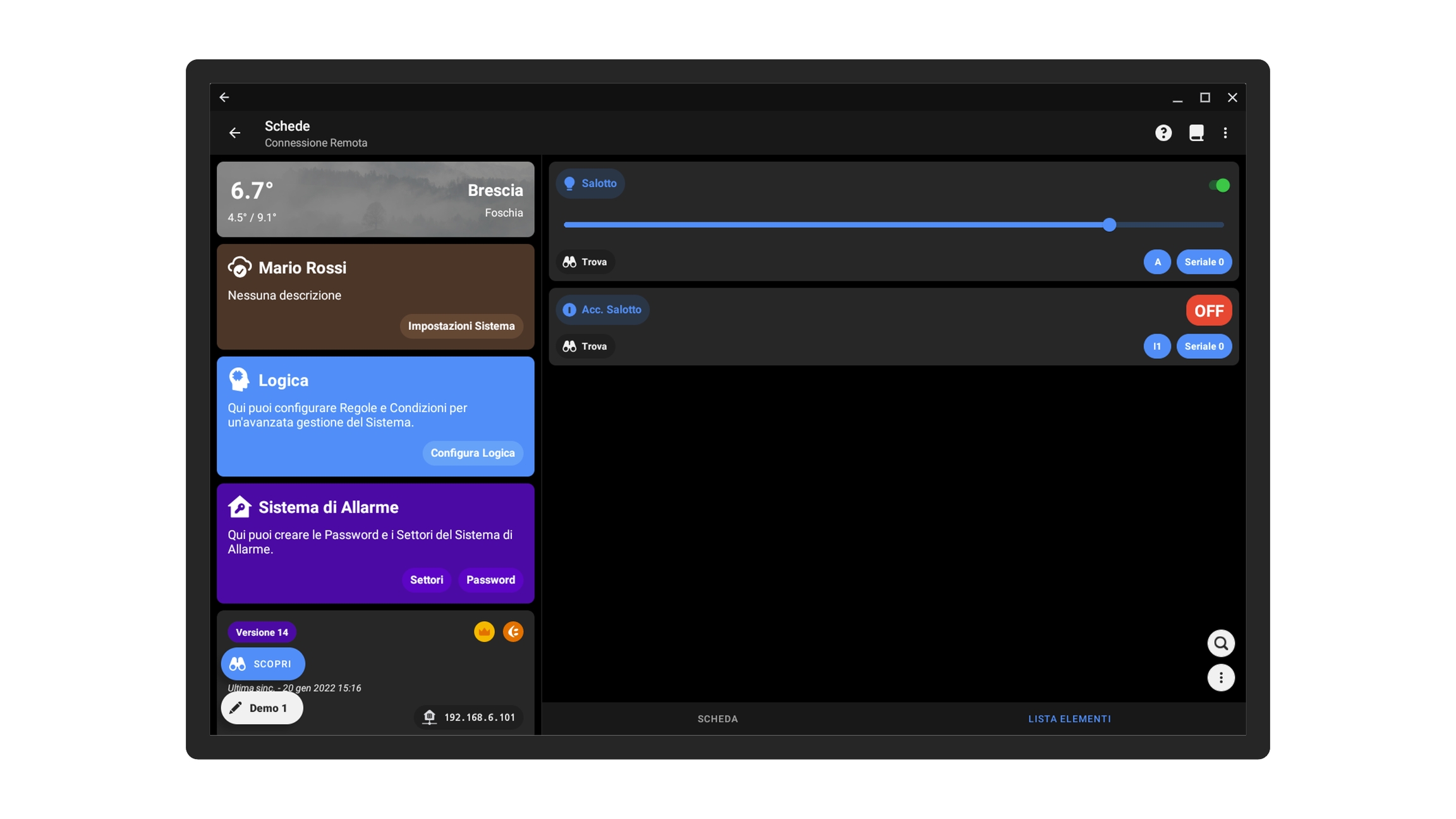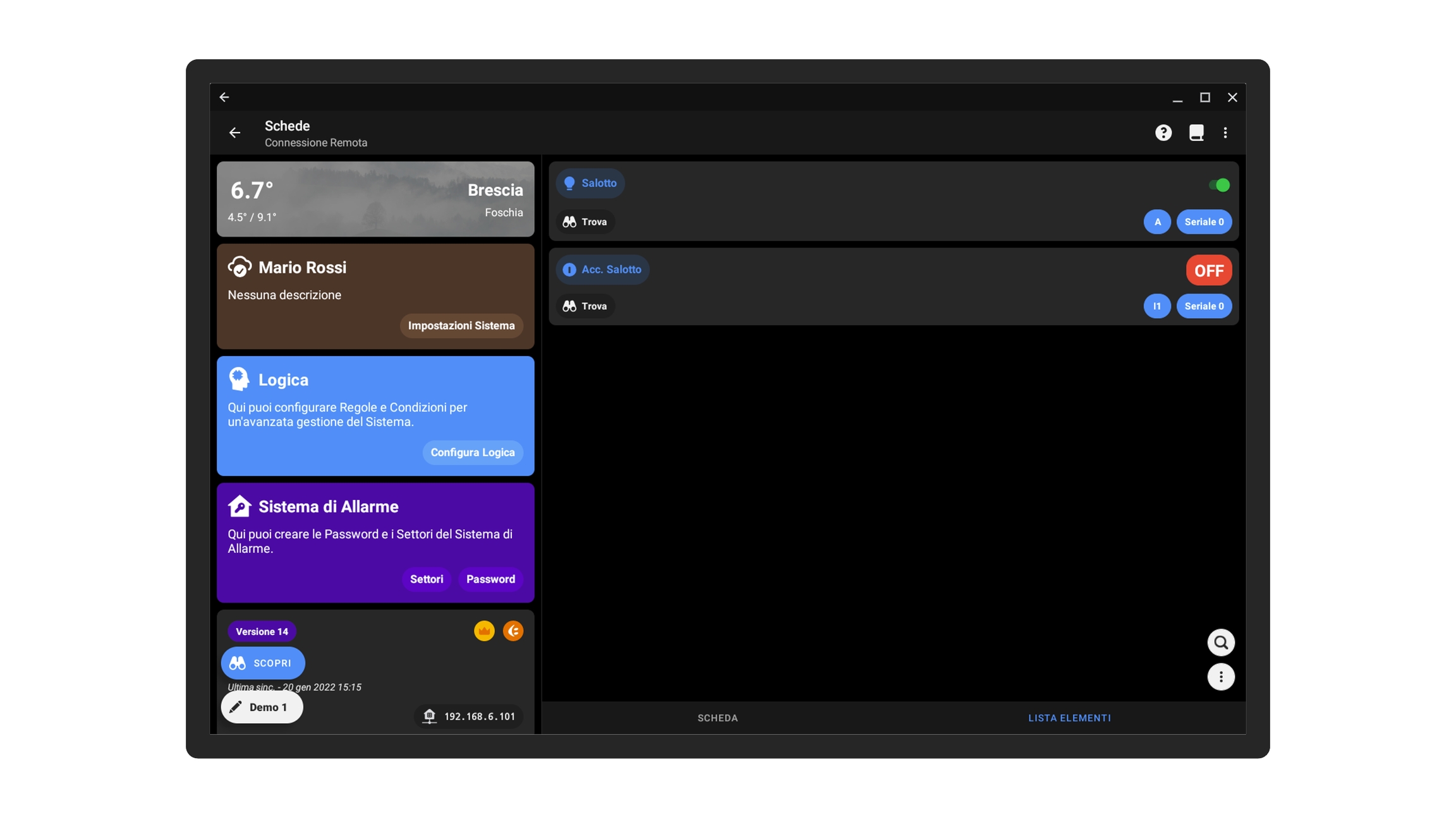 Per configurare un'apertura cliccare sulla scheda a cui verranno collegati gli output e gli eventuali pulsanti, andare sulla pagina Lista Elementi e cliccare sul pulsante in basso a destra con i tre puntini, quindi cliccare su Aggiungi +.