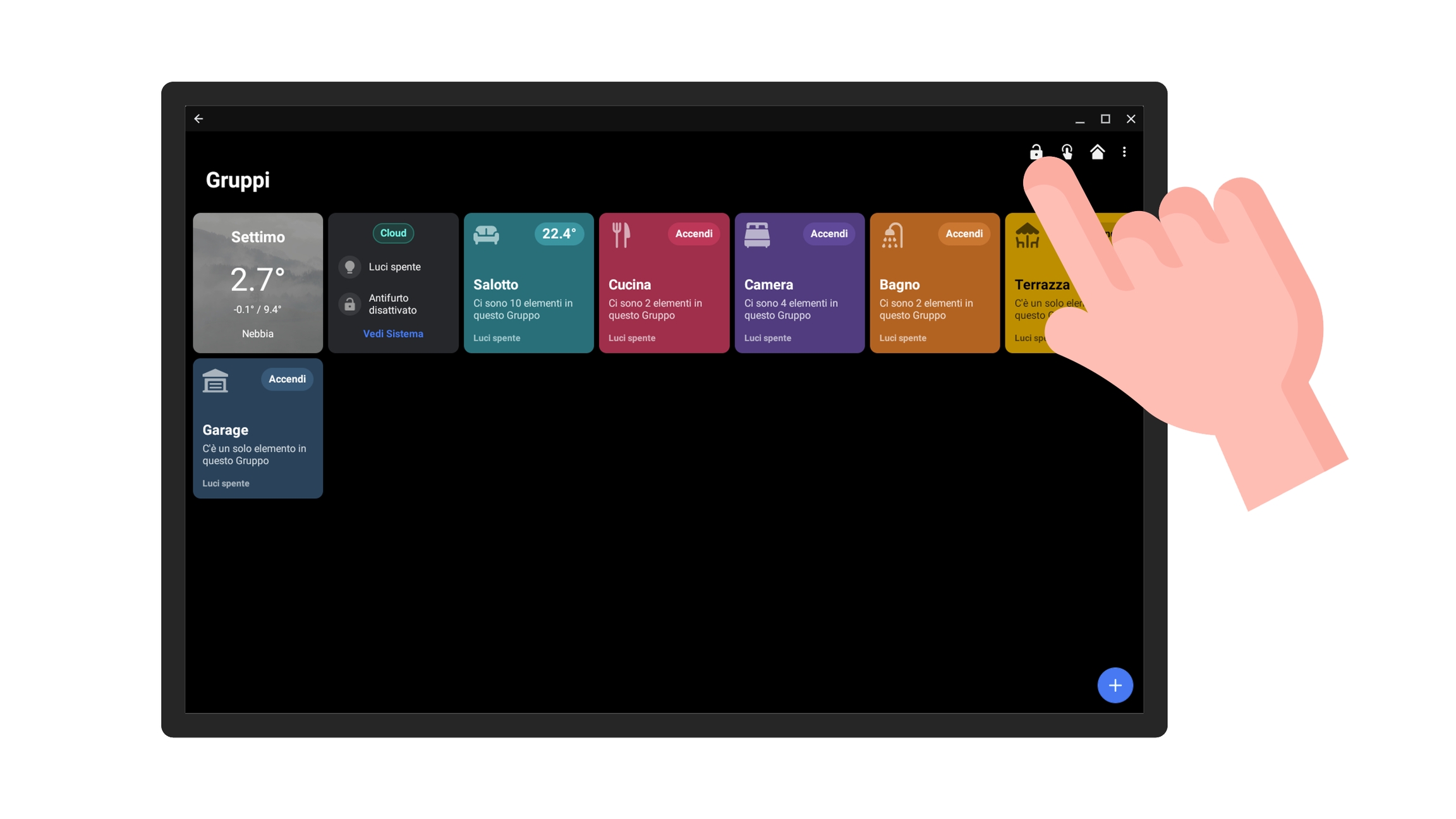 Per gestire l'allarme dall'app utente è necessario premere sul pulsante con l'icona di un lucchetto.
