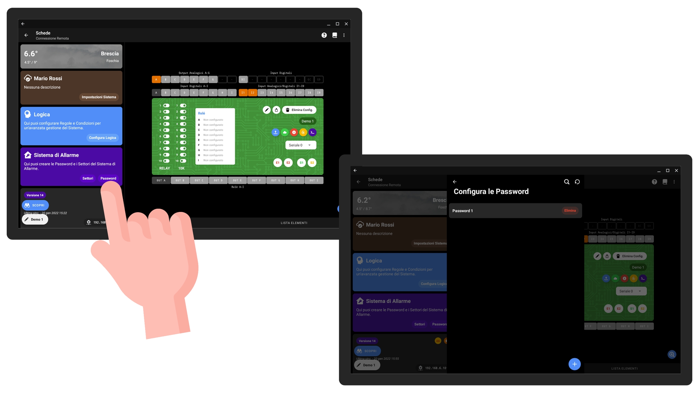 L'accesso ai settori dall'app utente non è possibile senza la configurazione delle password. Cliccate sul tasto Password nella scheda dedicata alla configurazione del Sistema di Allarme, quindi sul tasto +.