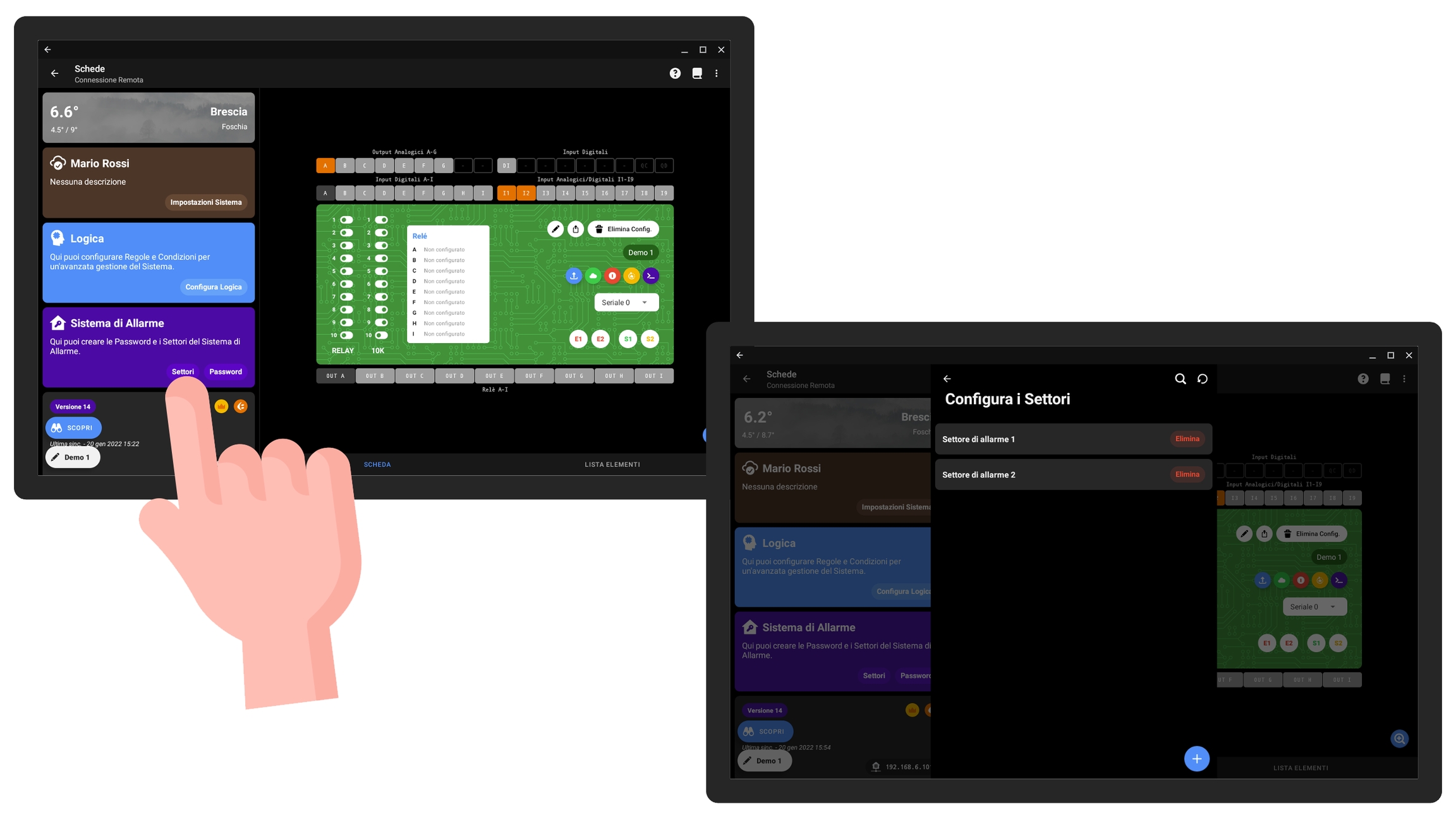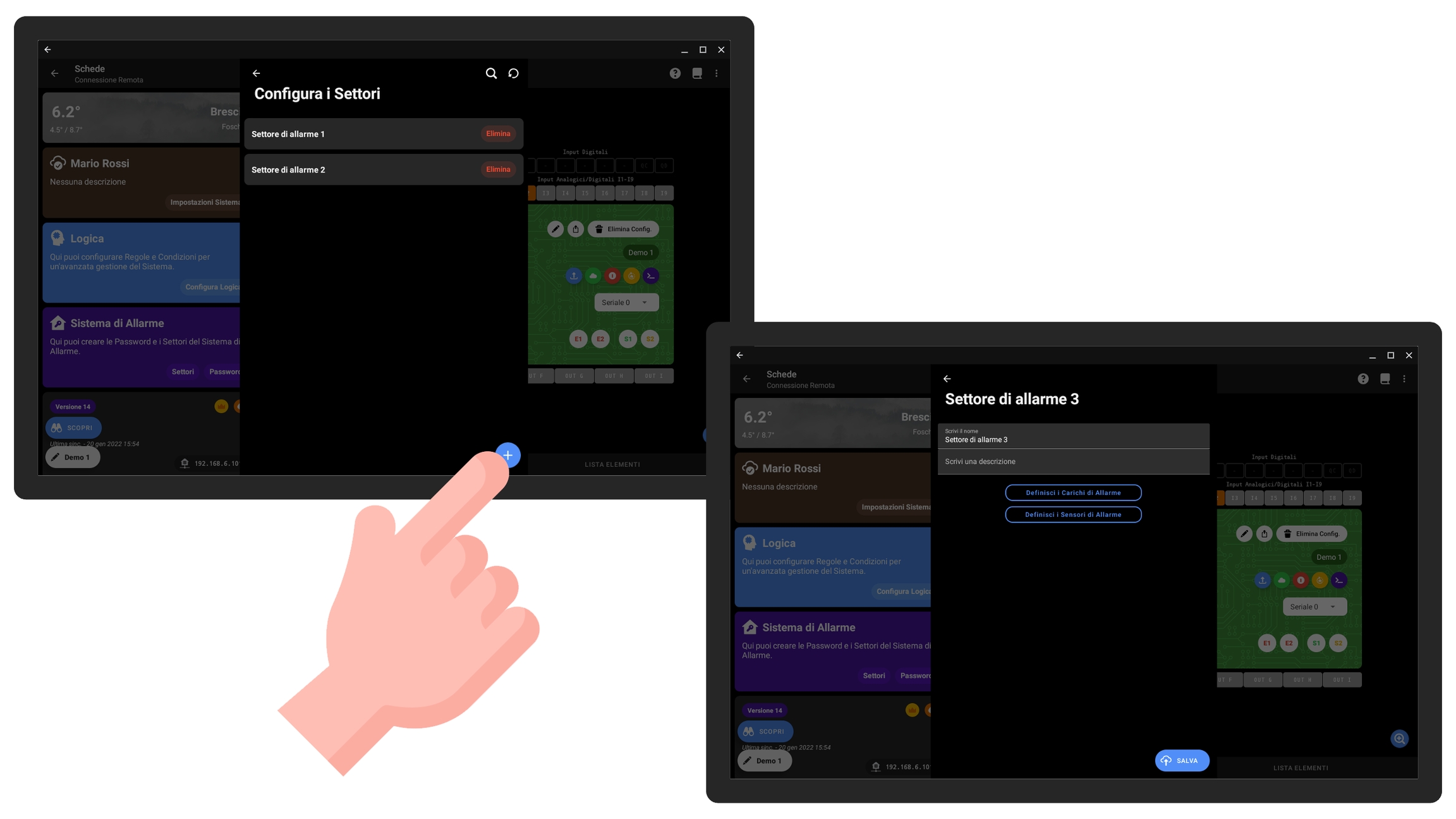 Ad ogni settore potete associare i sensori e i carichi di allarme che desiderate. In presenza di pochi sensori vi consigliamo di creare un solo settore; in genere il carico di allarme è unico per impianto, associatelo quindi al settore principale. Premete Salvaper confermare la configurazione.