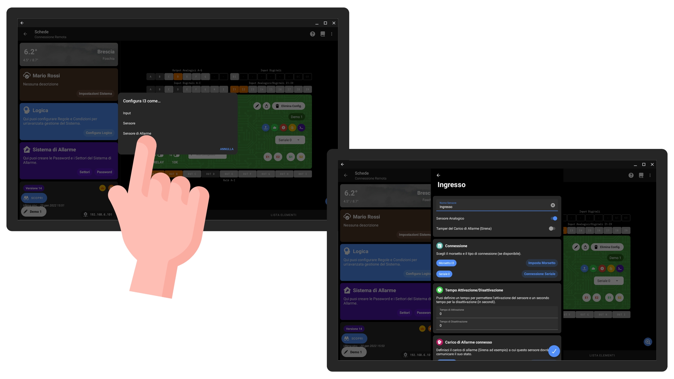 Per configurare un sensore di allarme è necessario cliccare sul morsetto scelto (nell'esempio abbiamo scelto I3