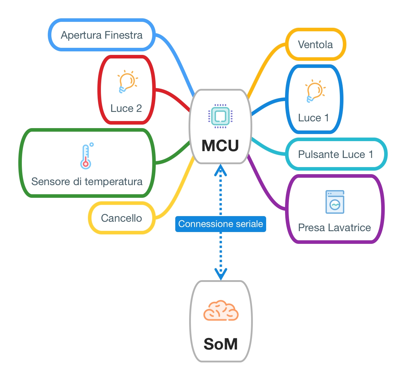 Gli output ed input sono fisicamente collegati al microcontrollore (indicato con MCU nella figura che segue) che comunica con la SOM attraverso un BUS seriale.