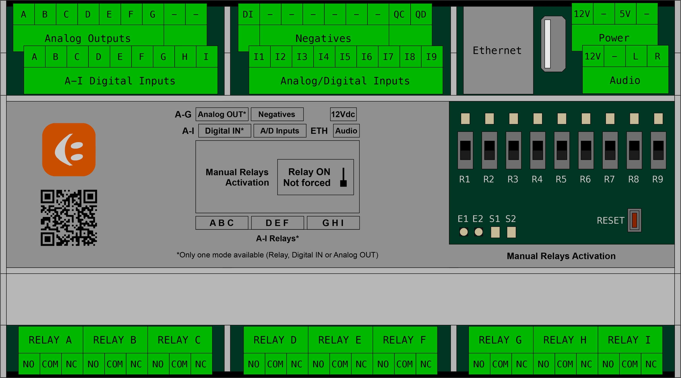 Ad ogni relè è associato un led di stato e un selettore per forzarne l’attivazione.