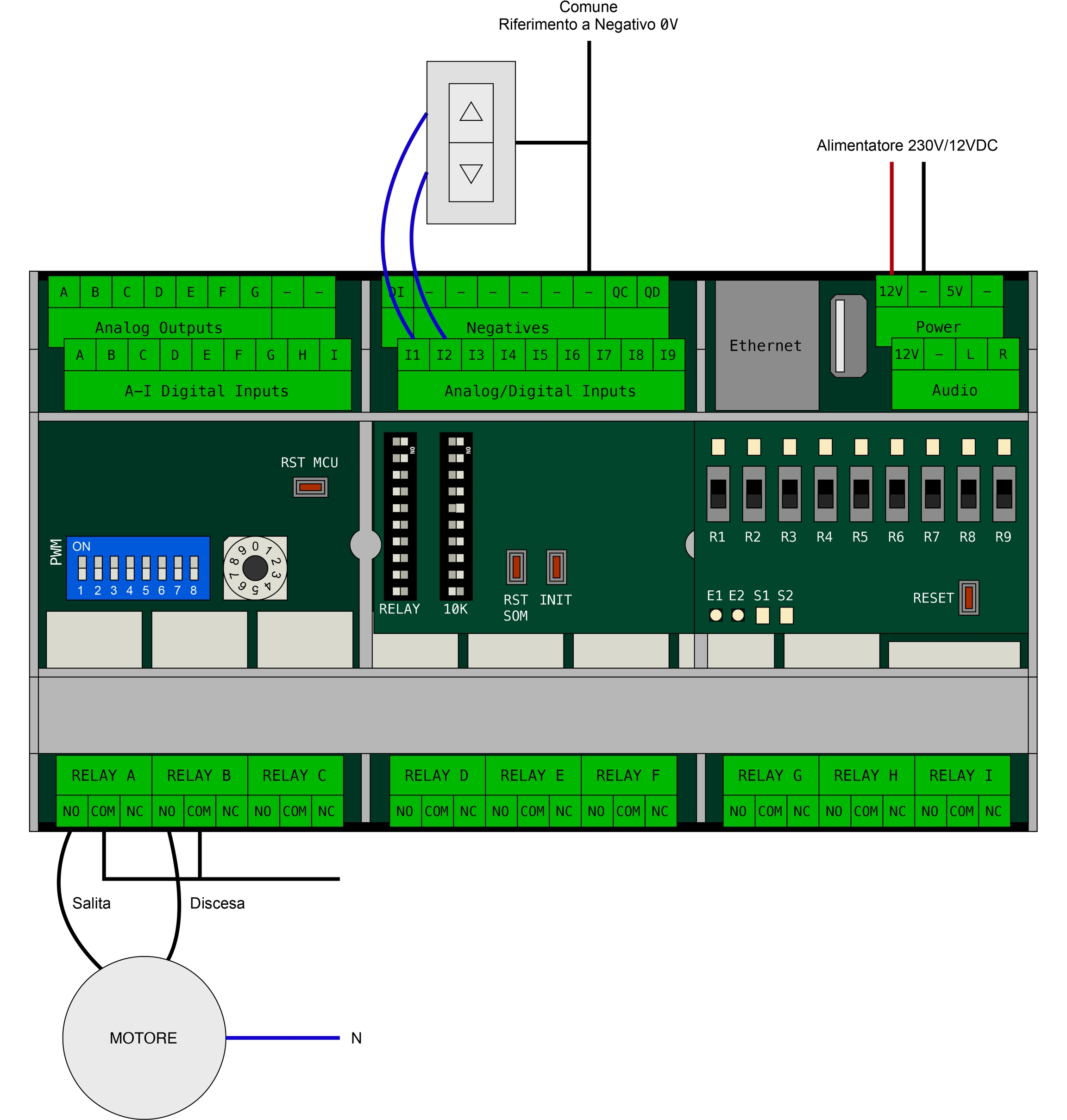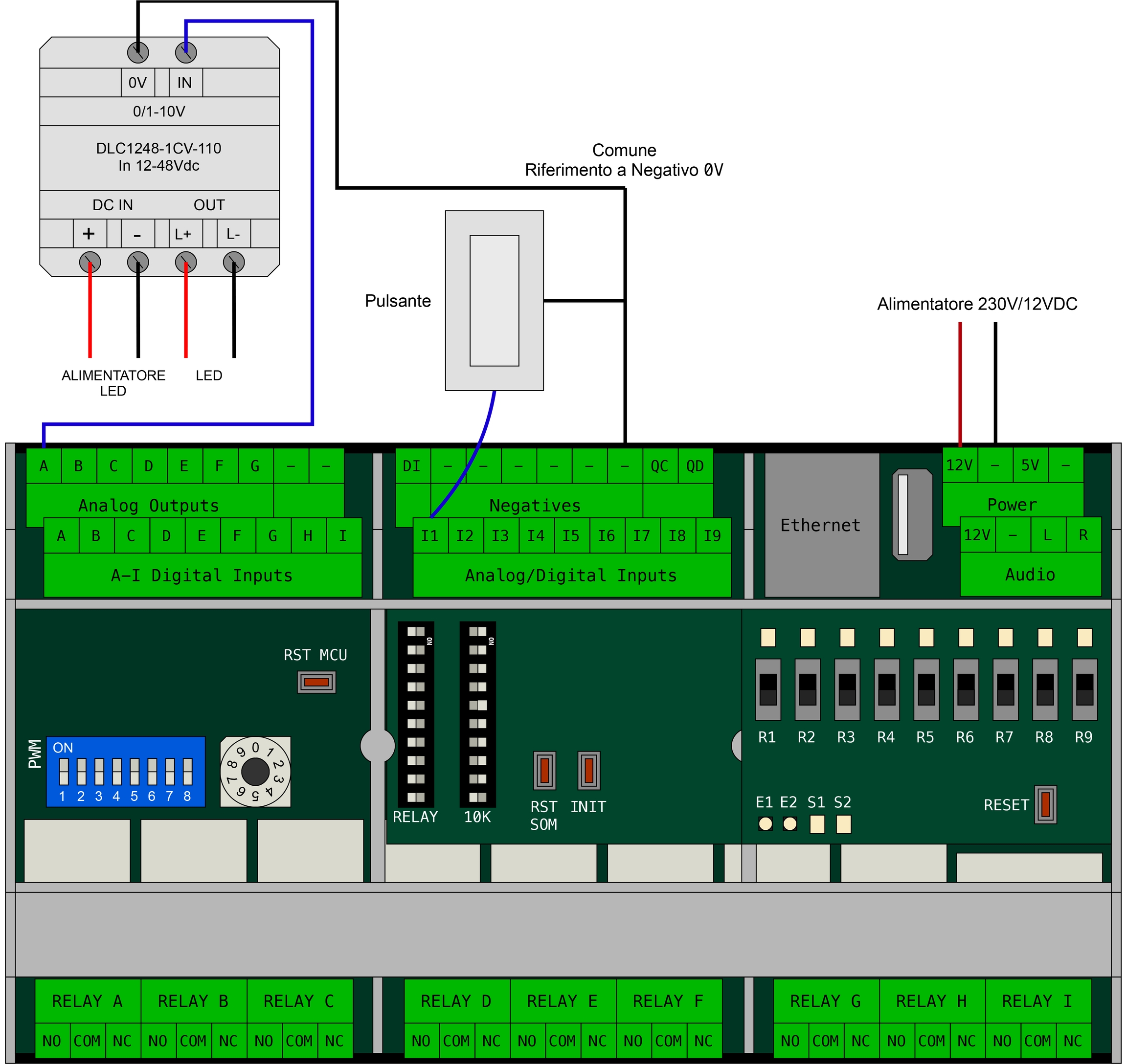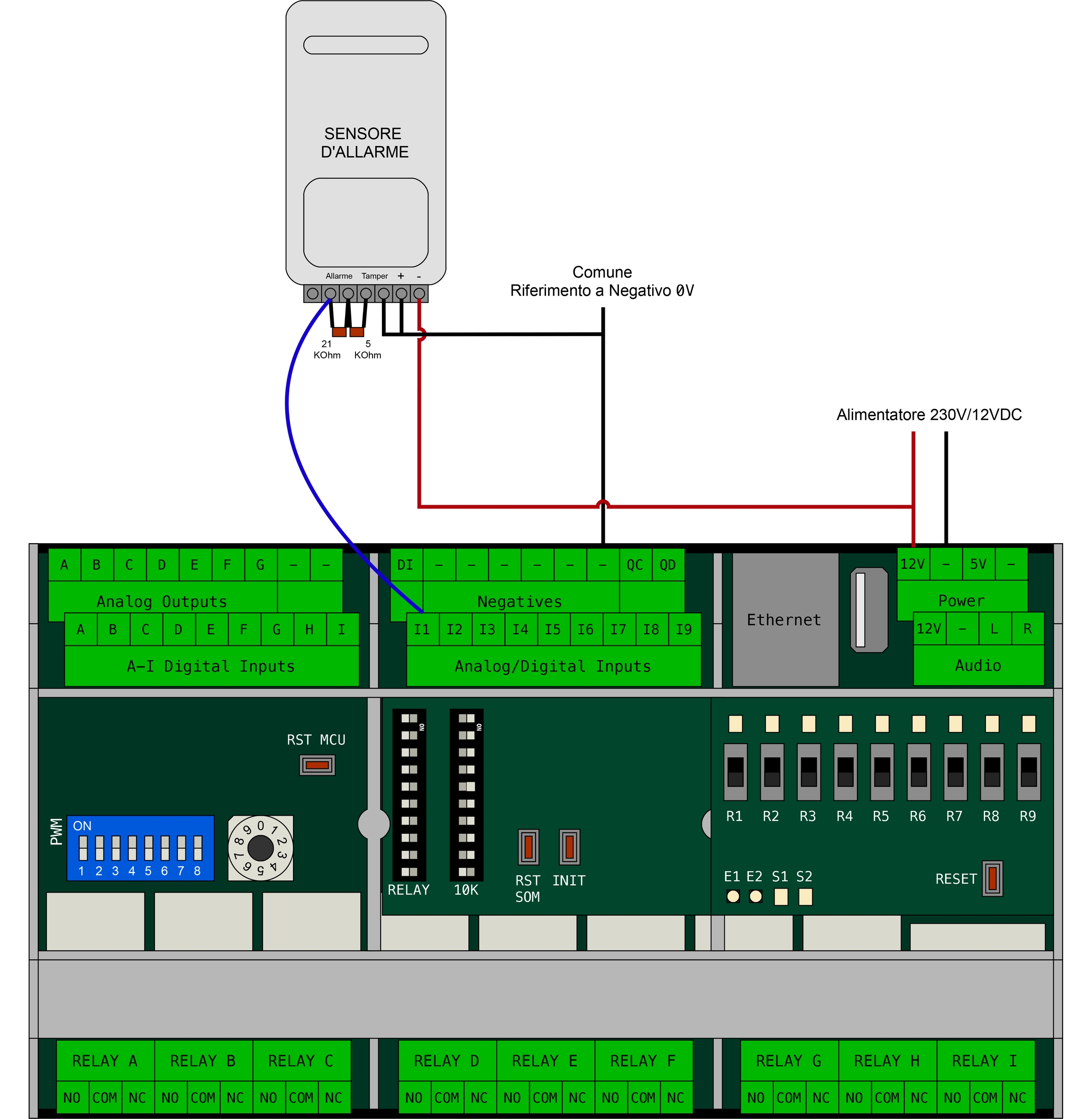Esistono molteplici tipologie di input digitali, ma in generale per tutti vale lo schema di collegamento del pulsante (mostrato in precedenza) e che prevede un collegamento a due fili, il comune negativo (che va collegato ad uno dei morsetti con il simbolo -
