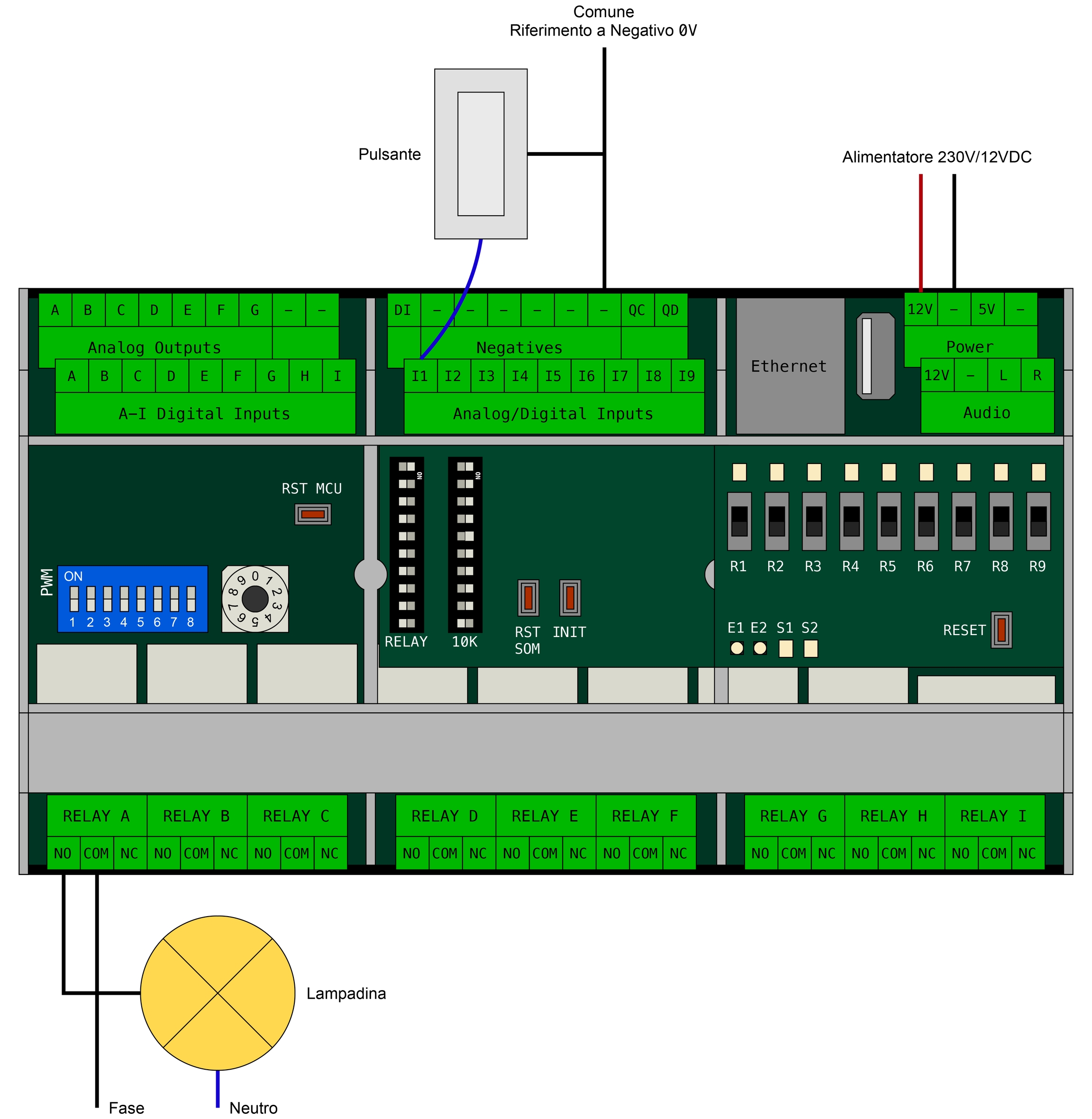 Di seguito un esempio di collegamento di un pulsante e di una luce (il collegamento vale per qualsiasi output che richieda un relé).