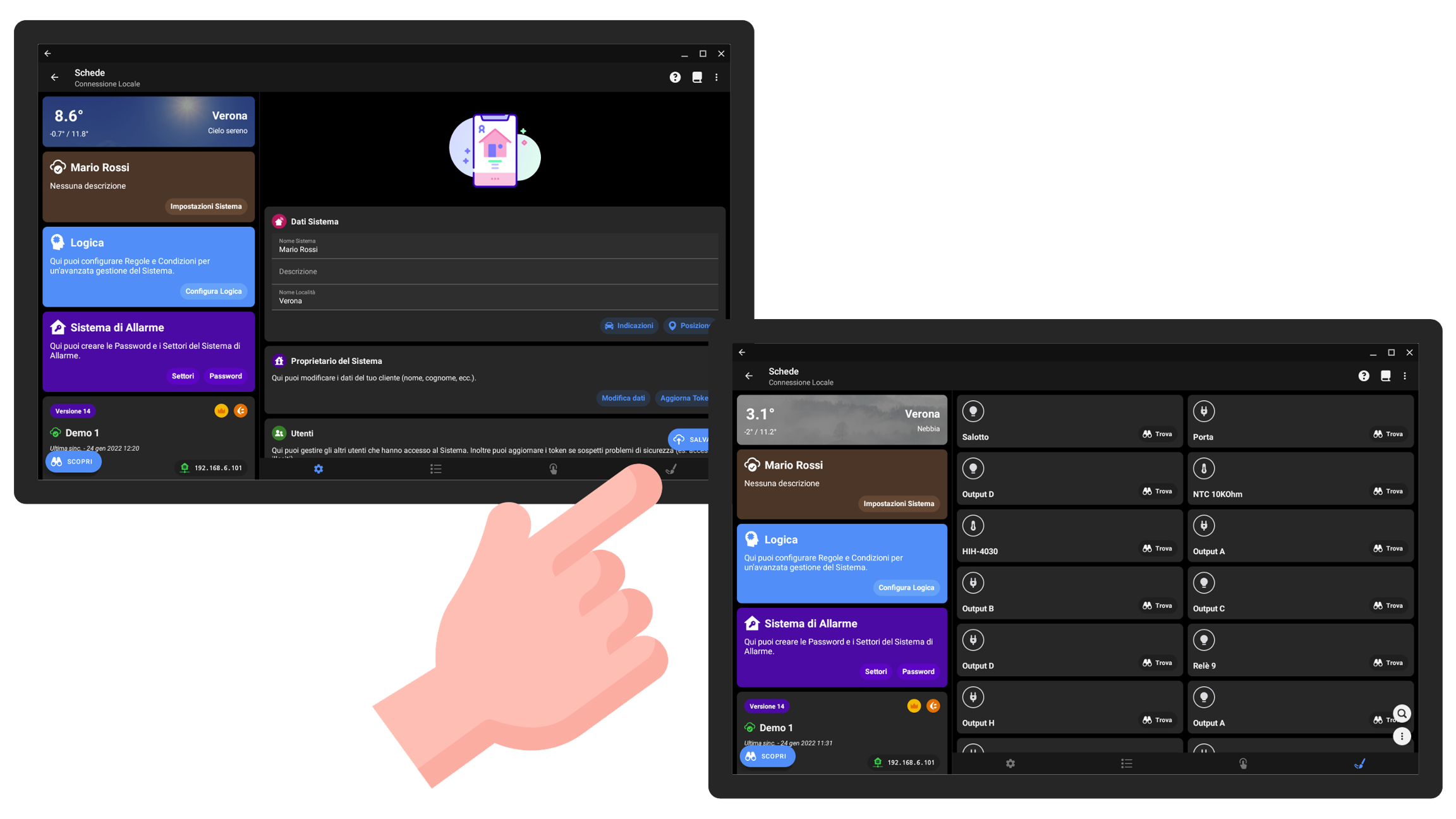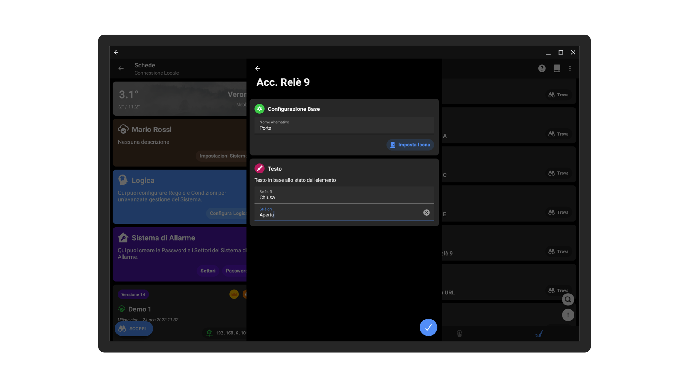L'app Chiarini Home Automation Tech permette inoltre di personalizzare i nomi dei dispositivi senza variare il nome di configurazione; questa funzione vi permette quindi di assegnare un nome utile a voi tecnici, che ad esempio richiama quello assegnato in schemi e progetti, e un secondo nome più familiare e comprensibile all'utente. Oltre al nome è possibile assegnare un'icona personalizzata per ciascuno degli elementi che avete configurato.