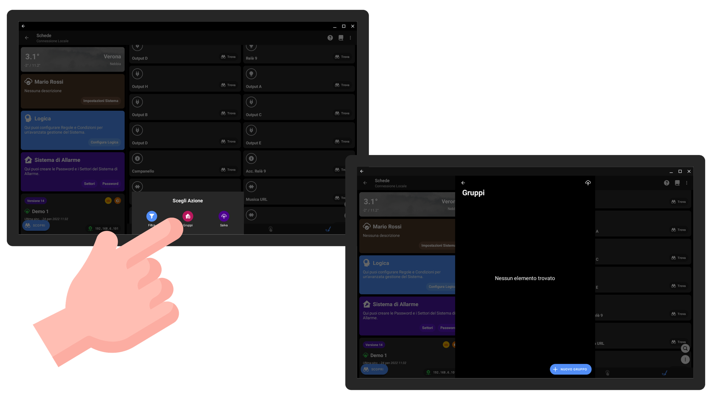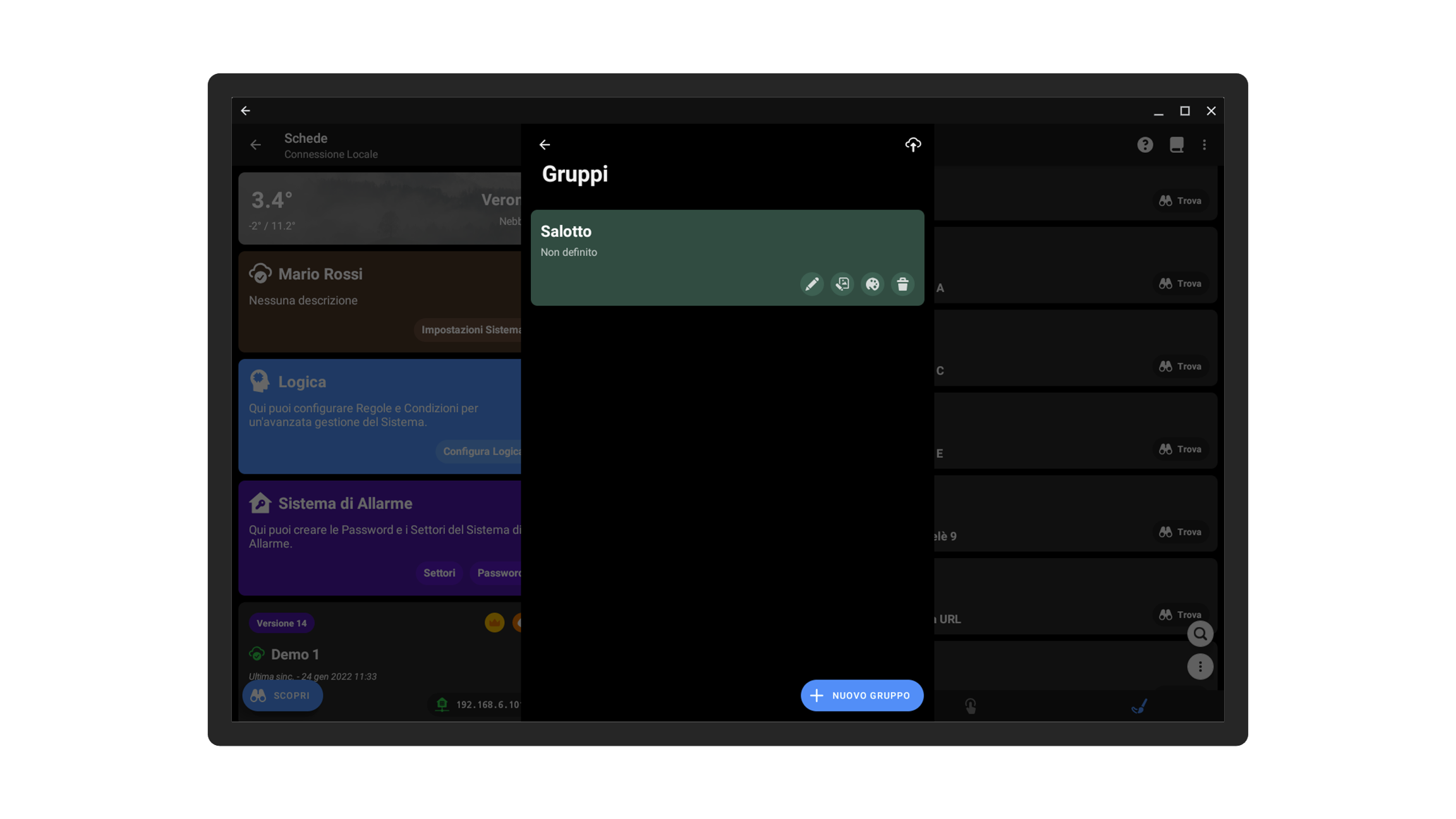 Un Gruppo permette di raccogliere una serie di elementi, anche di categorie diverse, così da offrire all'utente una migliore organizzazione dell'interfaccia. I Gruppi molto spesso rappresentano le stanze di una casa, i piani di un edificio, o i vari ambienti, sta a voi definire l'organizzazione ottimale.