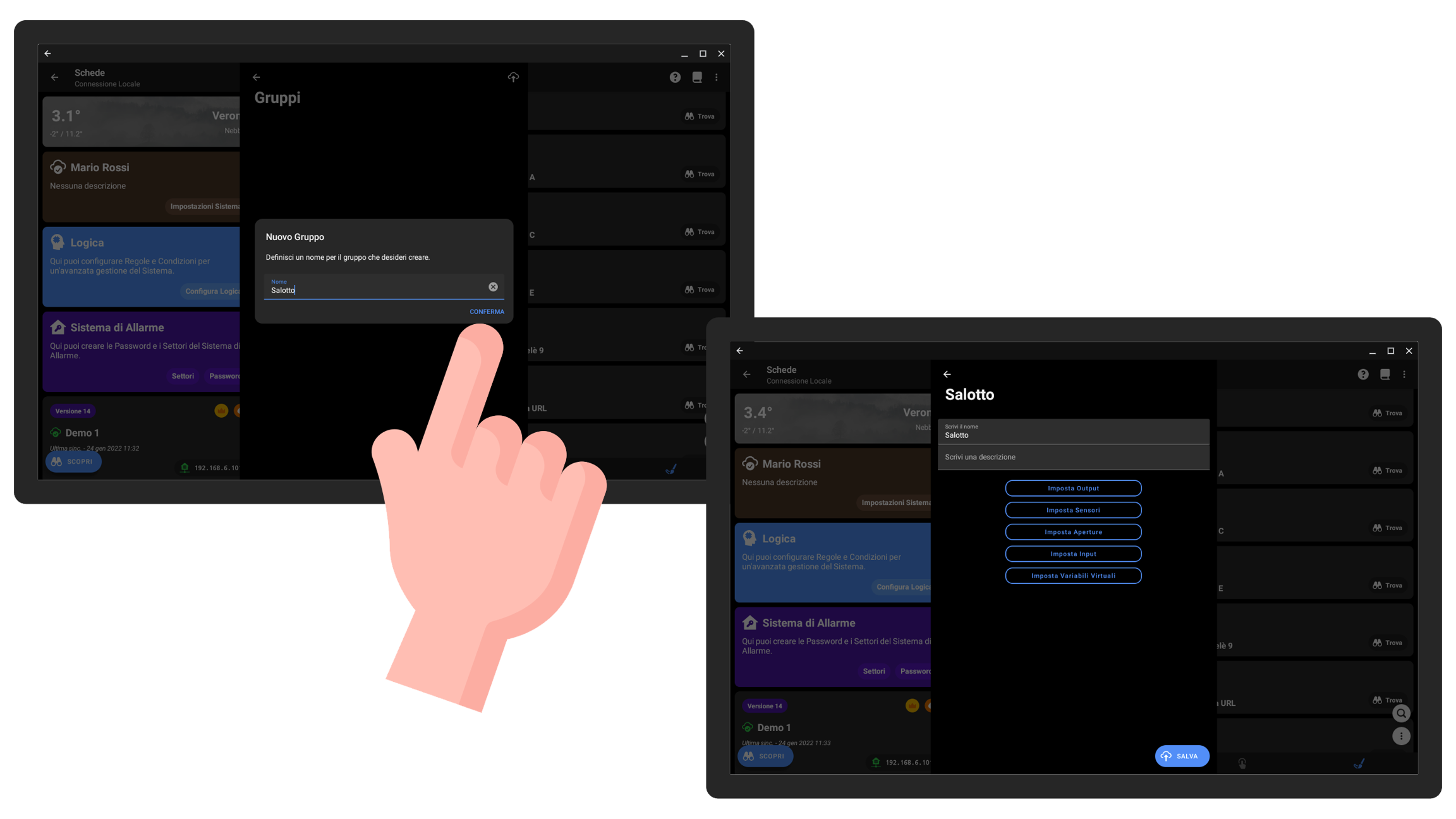 I gruppi definiti nell'app di configurazione non possono essere modificati dall'utente, ma soltanto nascosti; in ogni caso ogni utente dell'impianto può creare dall'applicazione i propri gruppi, non visibili agli altri utenti.