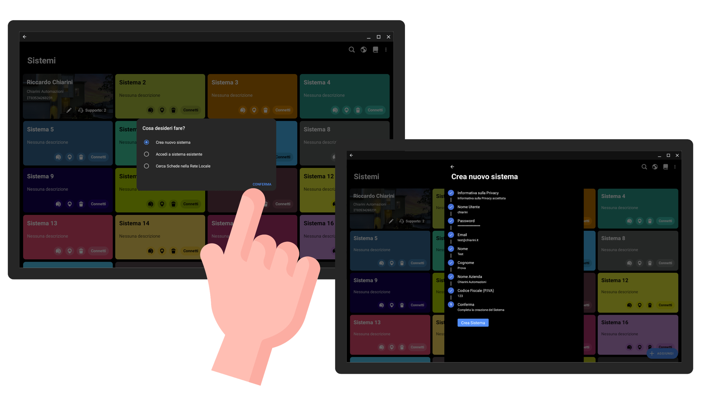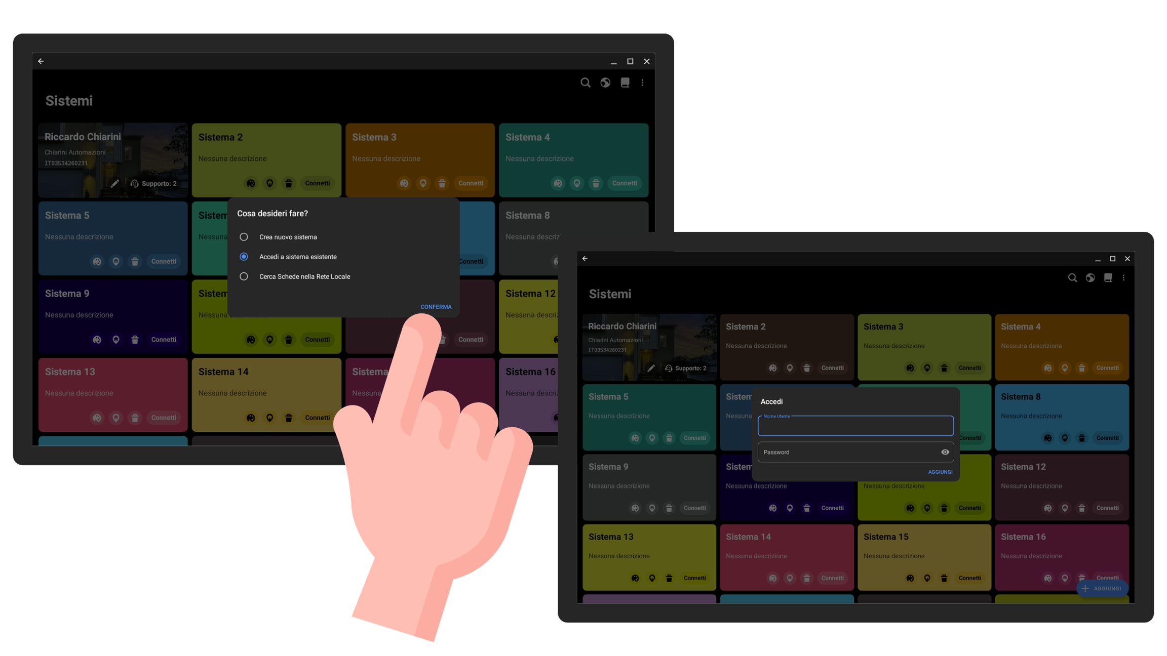 Una volta creato il Sistema (e confermato l'indirizzo e-mail del cliente) è possibile effettuare l'accesso cliccando nuovamente il pulsante +, quindi Accedi a sistema esistente.