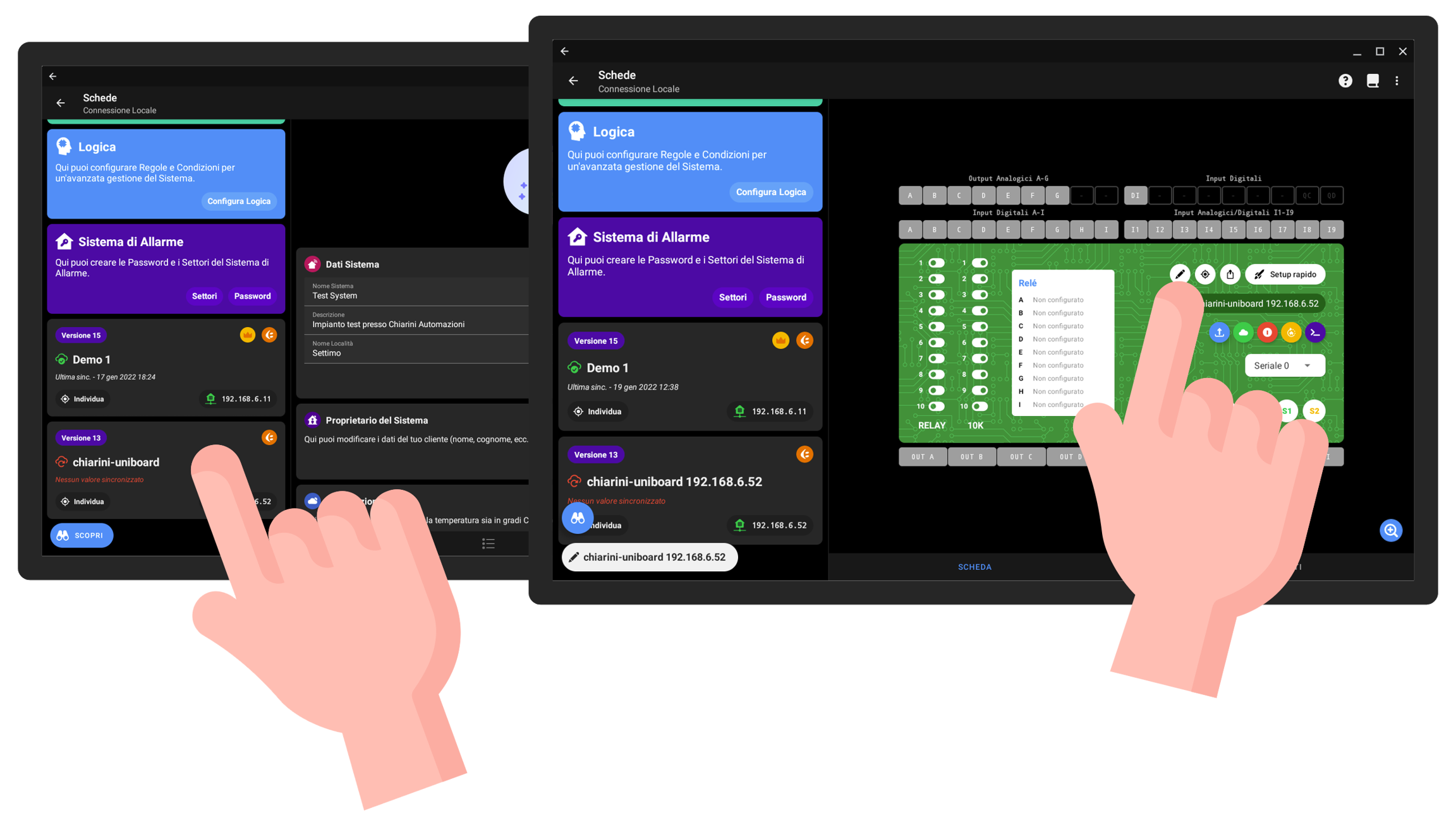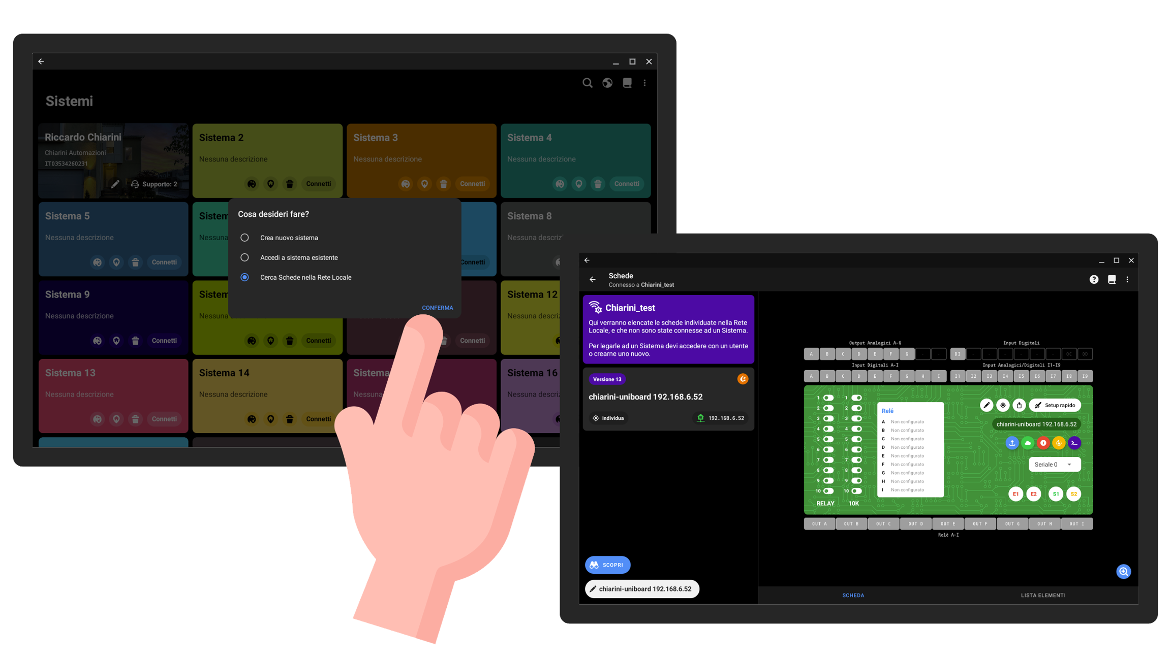 Nel caso in cui non si disponga di una connessione ad Internet, ma si voglia comunque procedere con la configurazione degli input/output a bordo scheda, cliccare su Cerca schede nella Rete Locale.