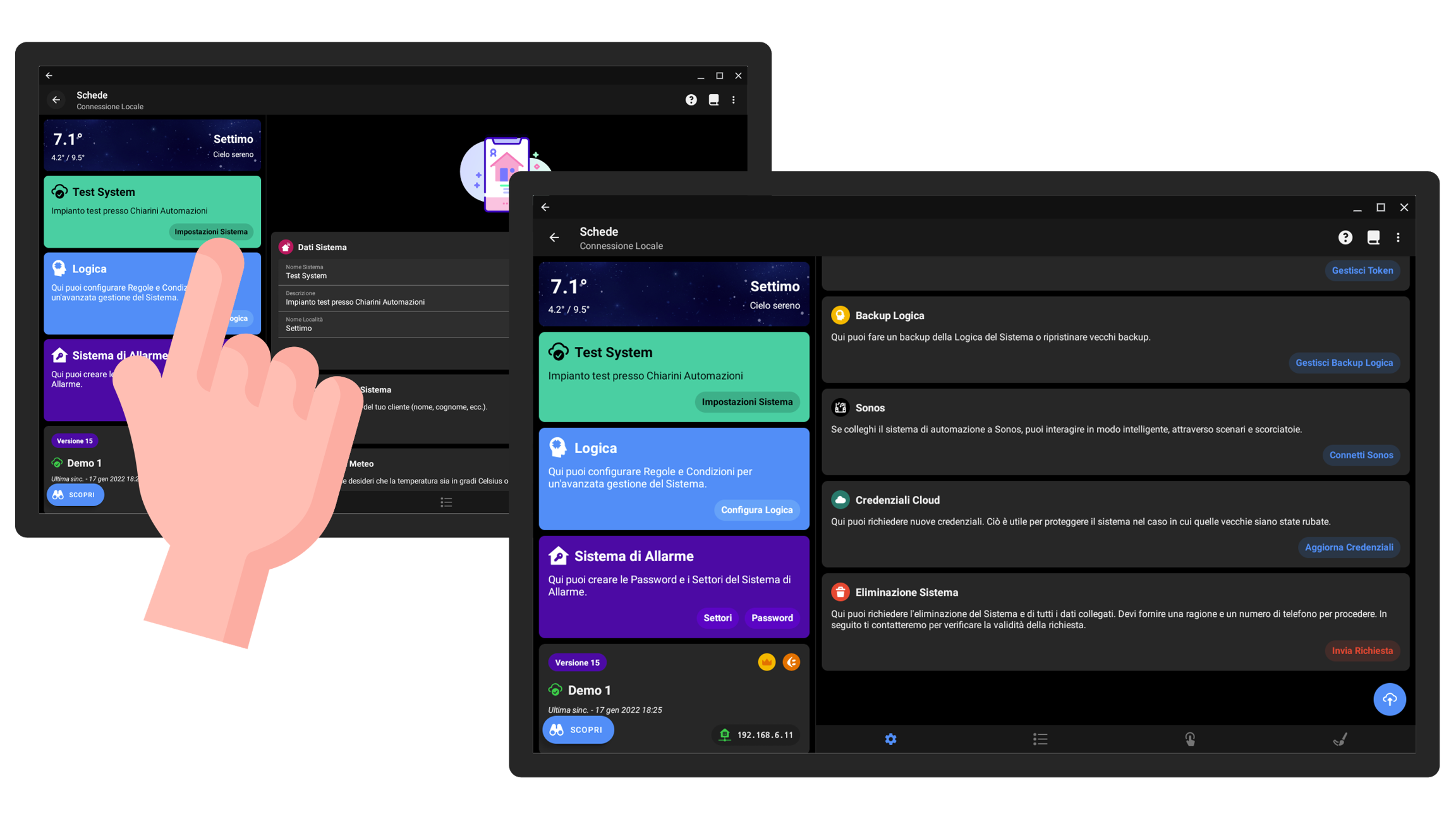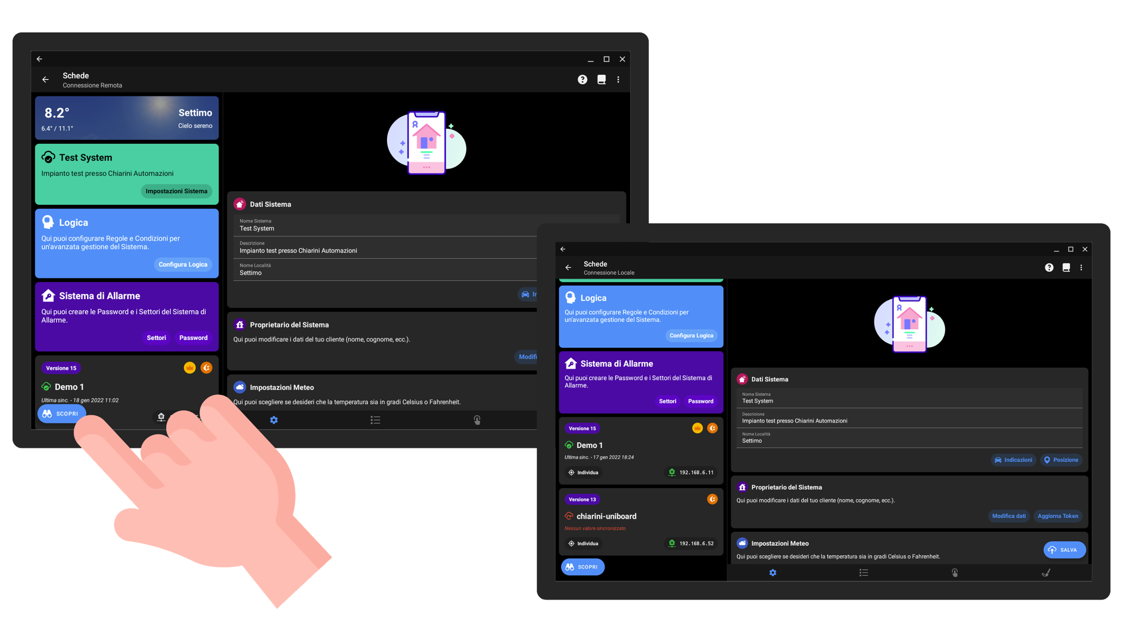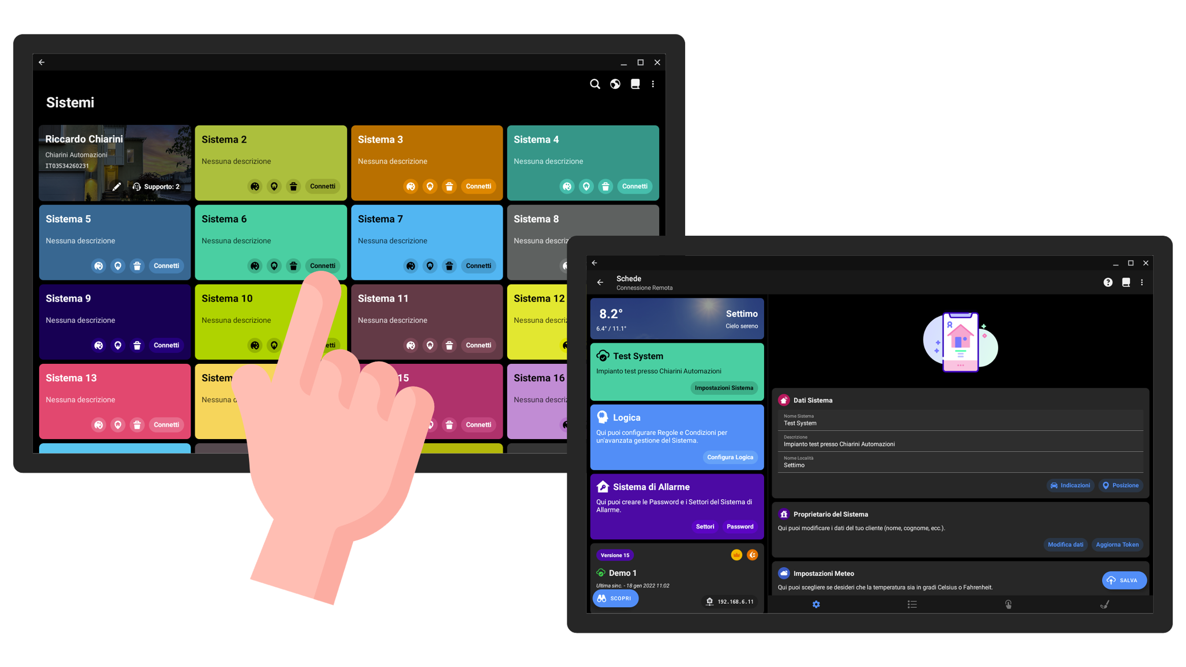 Per la creazione del Sistema via app è sufficiente una connessione Internet, mentre per configurare le schede è necessario fornire ad esse alimentazione e collegarle ad una rete mediante cavo ethernet.