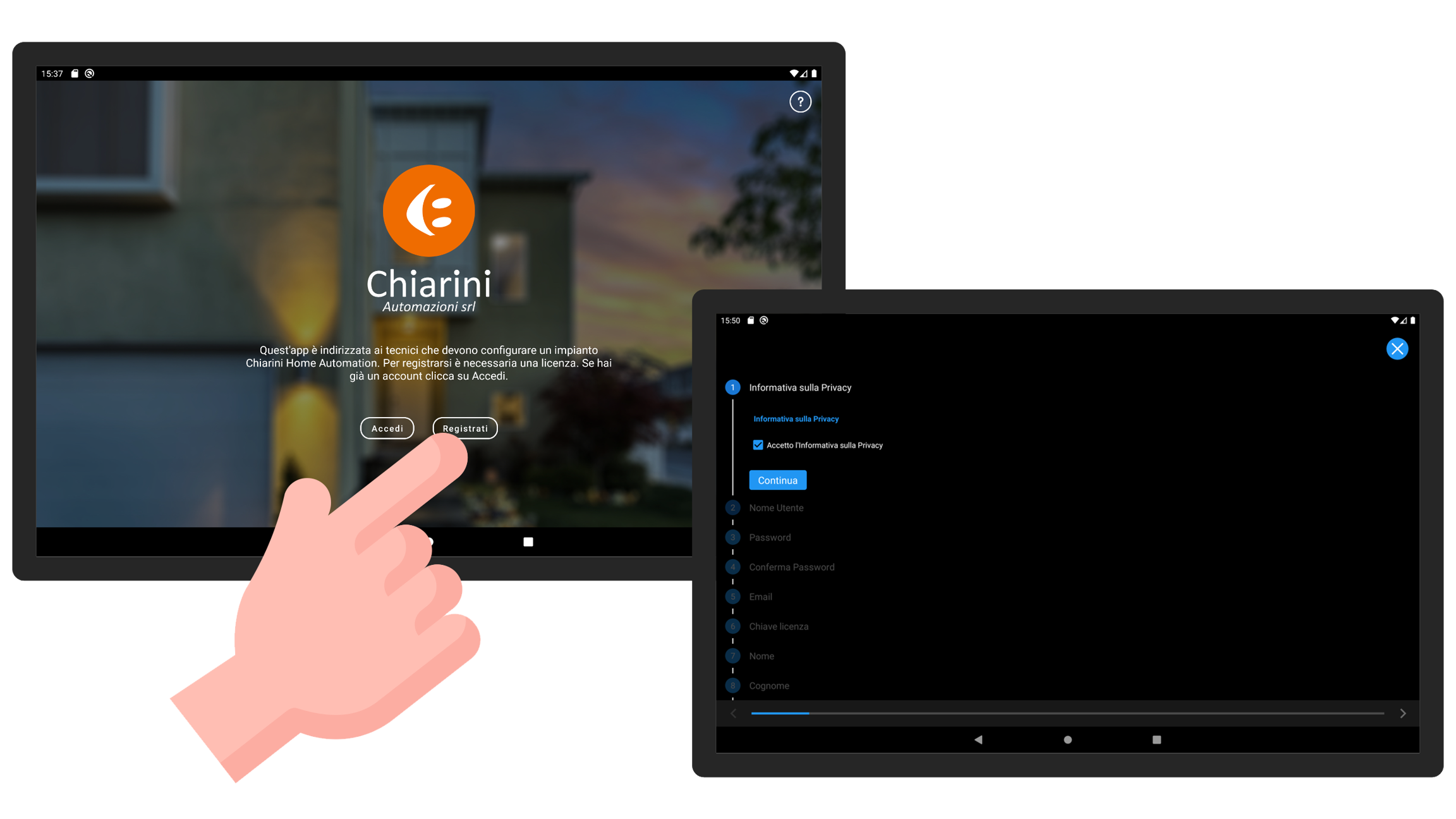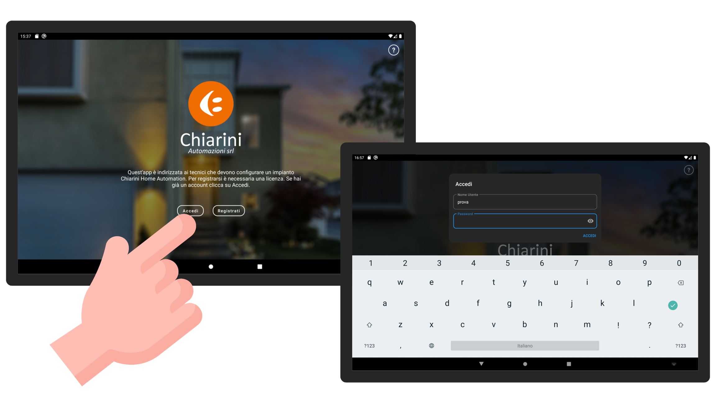 La prima cosa da fare è dotarsi di un tablet o smartphone Android ed installare l'app Chiarini Home Automation Tech presente sul Google Play Store (è possibile scaricare l'app anche sui Chromebook che includono Google Play).