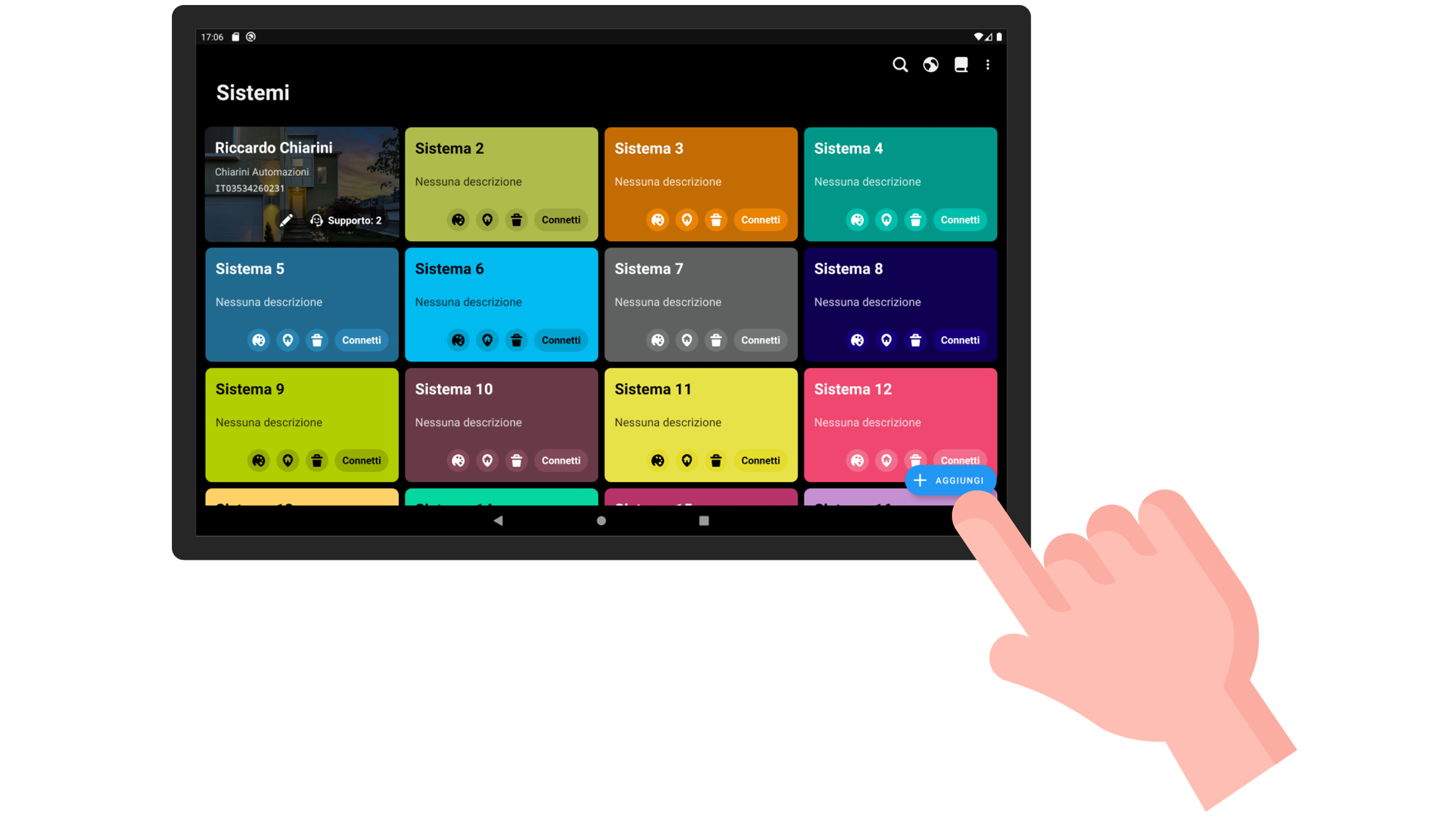 Le schede già connesse presentano una nuvoletta verde con la spunta alla sinistra del nome, nel caso contrario verrà visualizzata una nuvoletta rossa. È stata scelta l'icona di una nuvola perché le schede, una volta connesse al sistema, saranno anche connesse al Cloud.