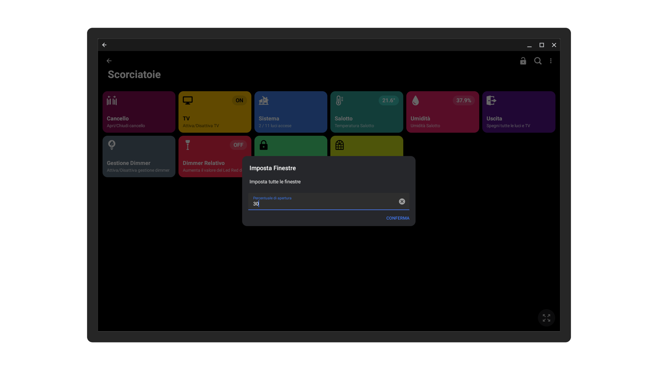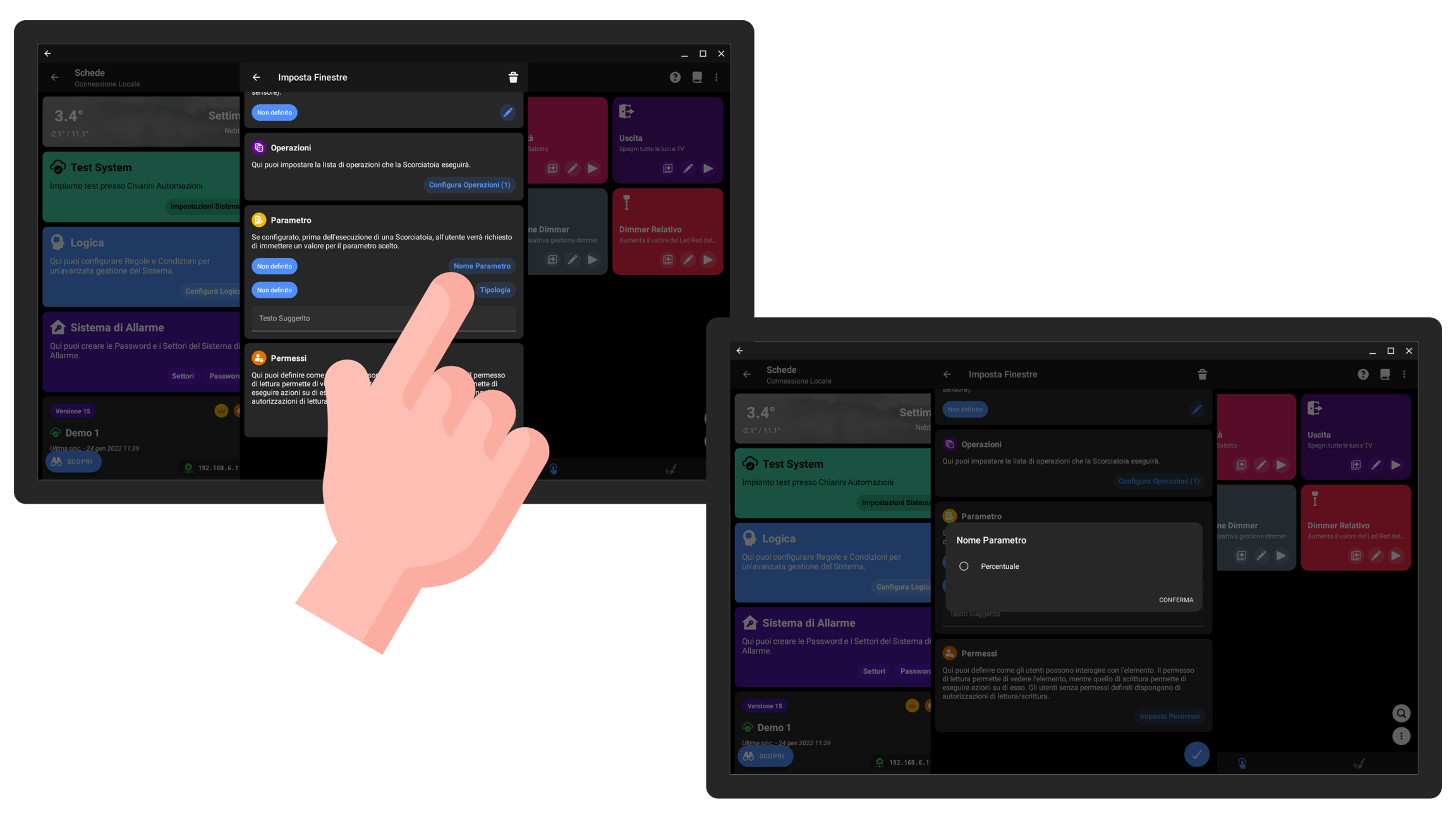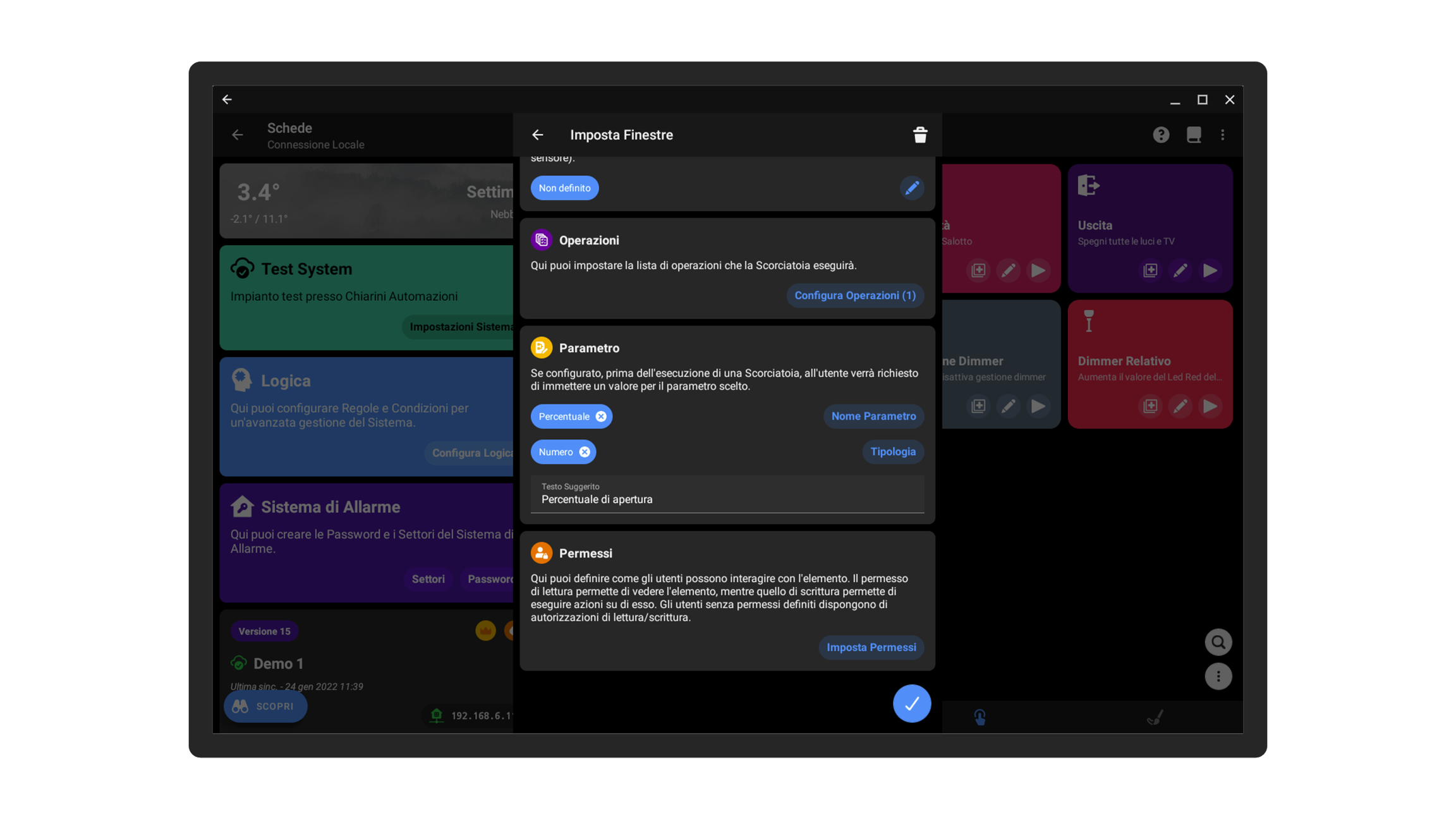 Prendiamo il caso di una casa con 10 finestre che desiderate impostare alla medesima percentuale di apertura. Per evitare di creare più scorciatoie che impostano le finestre a percentuali predefinite, potete crearne una sola e impostare come Parametro la Percentuale di apertura; in questo modo all'utente verrà richiesto di inserire la percentuale, e tutte le 10 finestre si apriranno del medesimo valore.