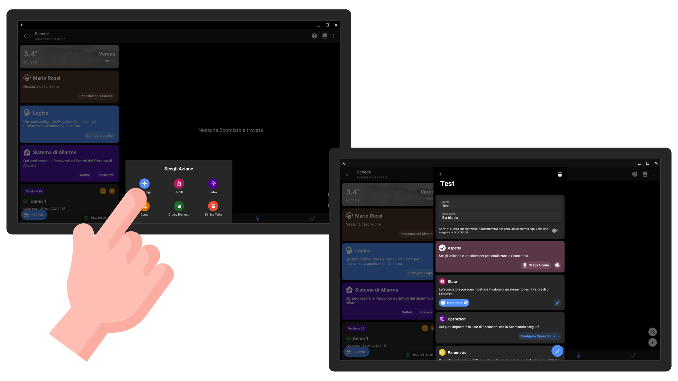 Dall'app di configurazione è possibile configurare le Scorciatoie che si desidera offrire di default, ma anche l'utente può aggiungerne di proprie.